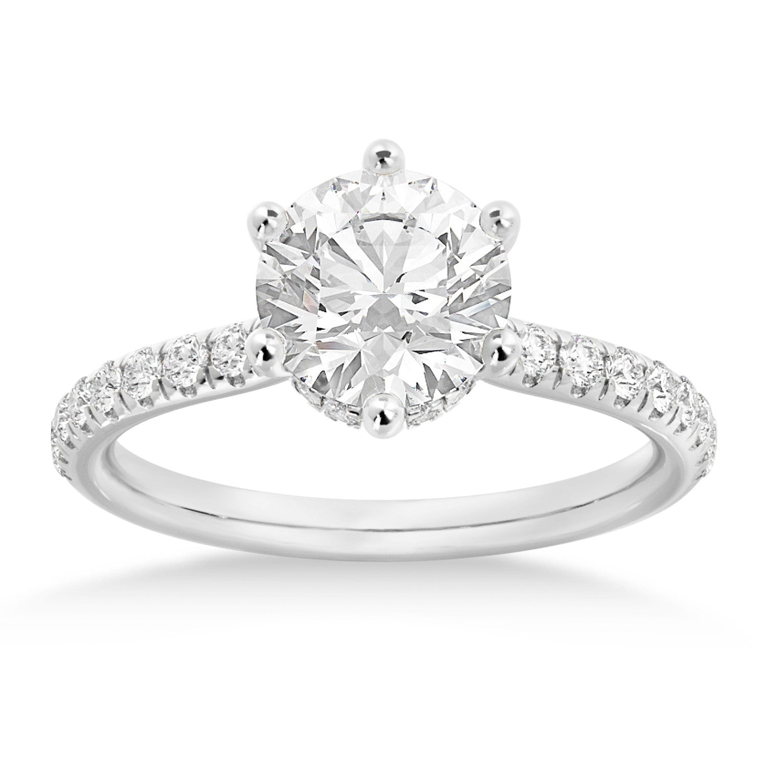 This beautiful six prong engagement ring is designed with a hidden halo setting to hold a center stone of any carat, cut, clarity and color. Choose the stone that is the best fit for your future fiancee in this unique ring setting.