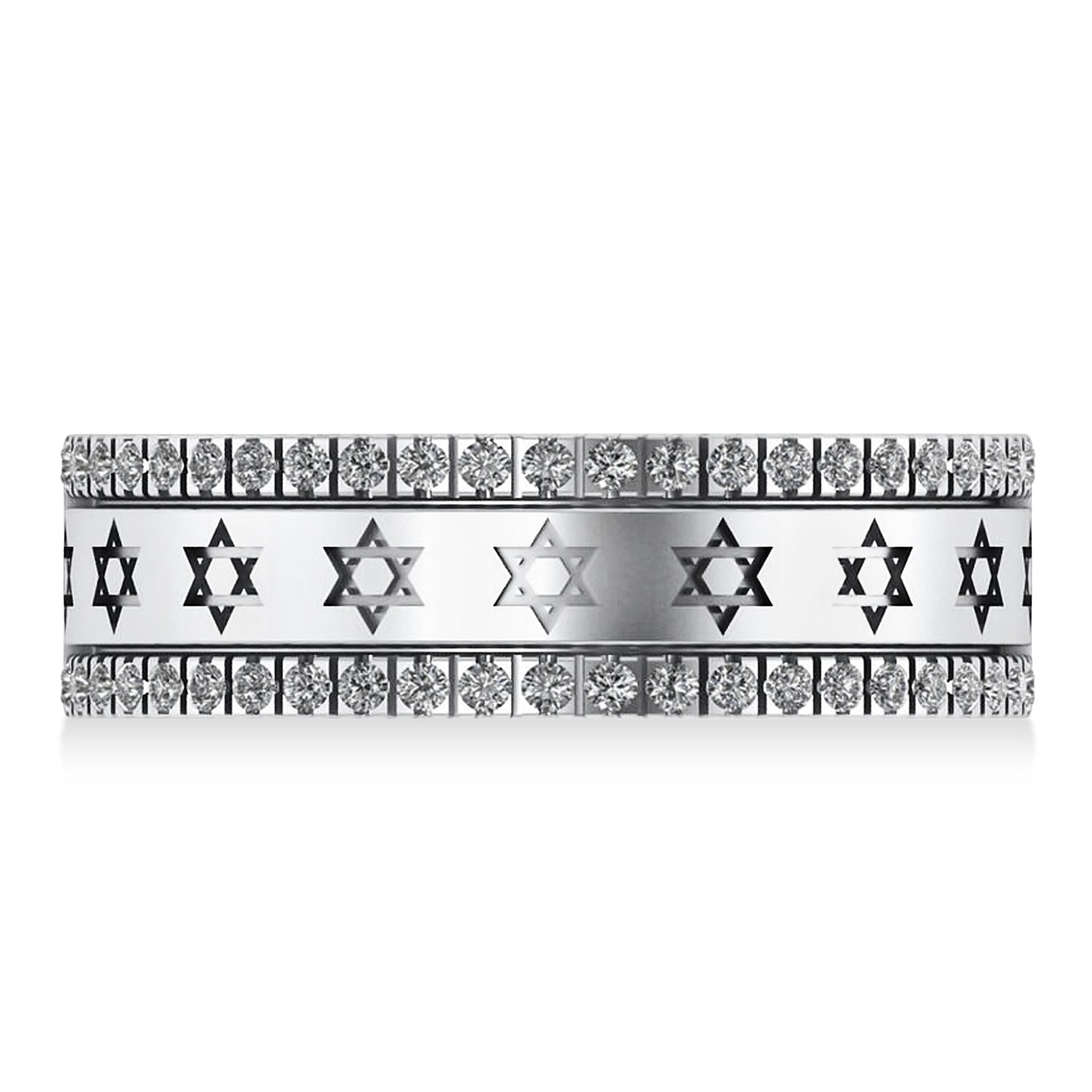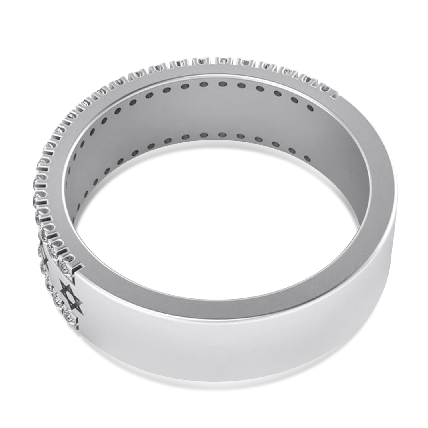 From our Judaica Jewelry Collection - Faith Meets Luxury: Our Diamond Jewish Star of David Mens Ring in 14K White Gold seamlessly blends tradition and opulence. The continuous row of delicately set .46ct diamonds creates a dazzling effect, while intricately etched Star of David symbols symbolize strength and identity. Prong set on edges adds charm to this modern heirloom. A meaningful gift or personal keepsake, perfect for special occasions or everyday wear.