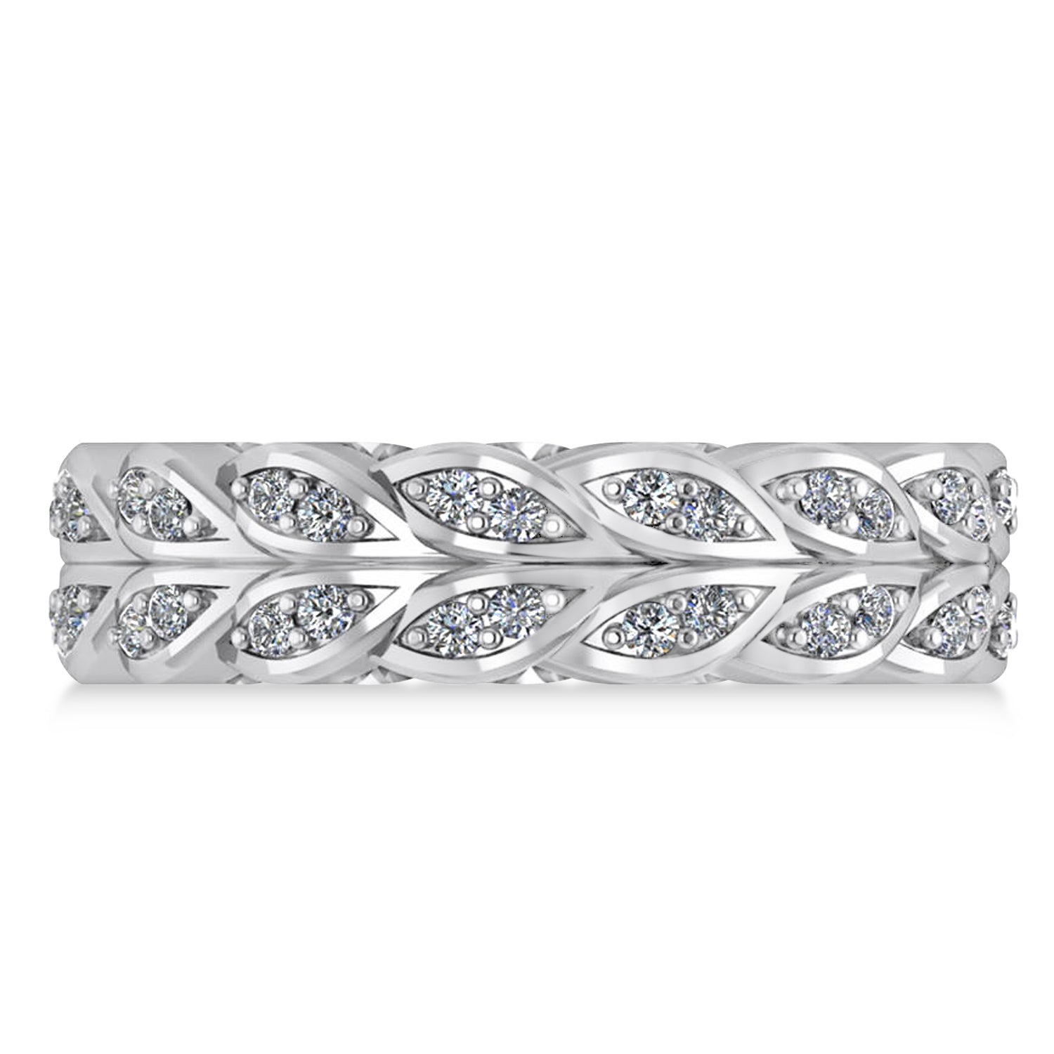 Our exclusive diamond leaf wedding band is certain to compliment your look. With a flowing leaf design, it is studded with 60 diamonds of .01ct each, and is crafted from 14k white gold. The wide 6.5mm band is sure to match any outfit.