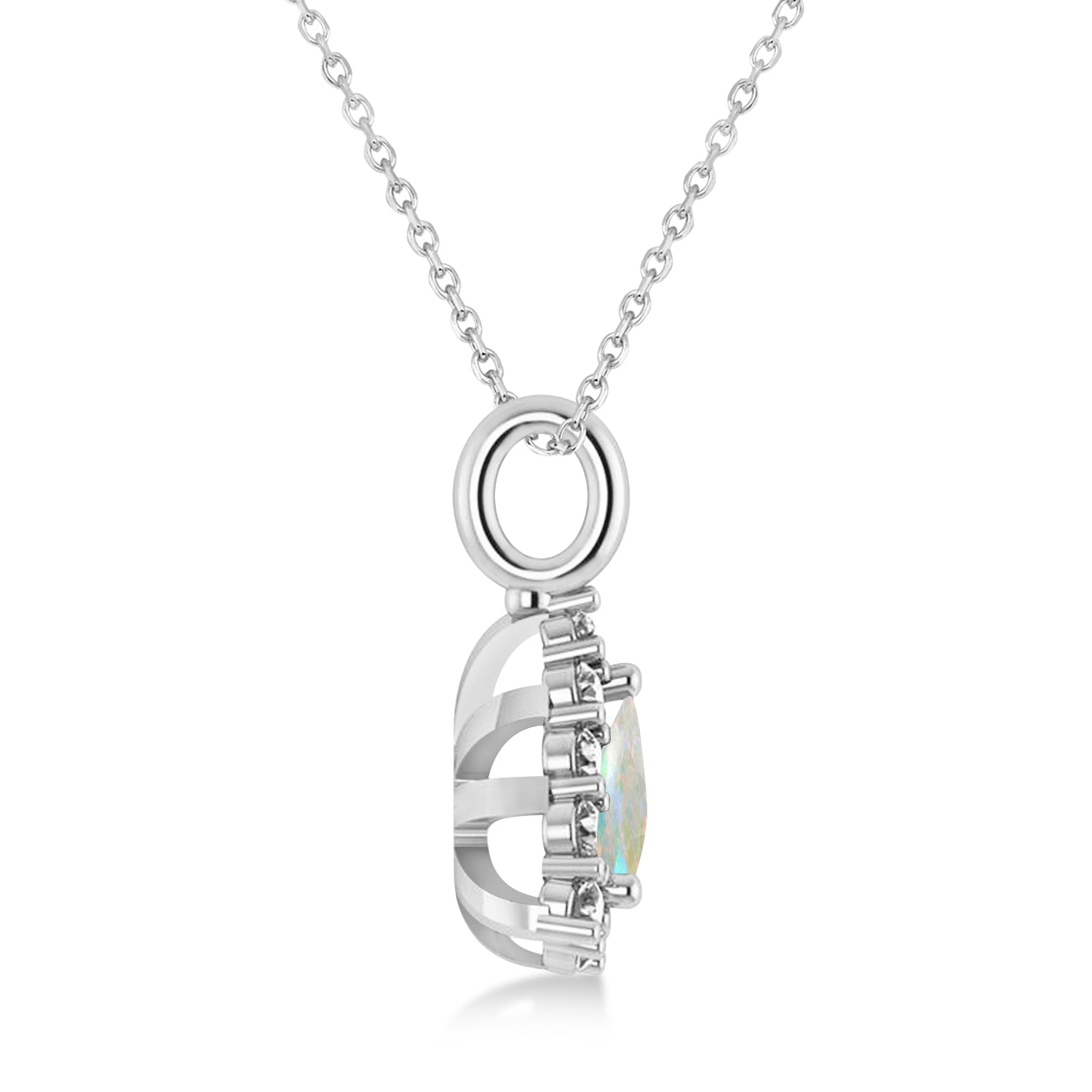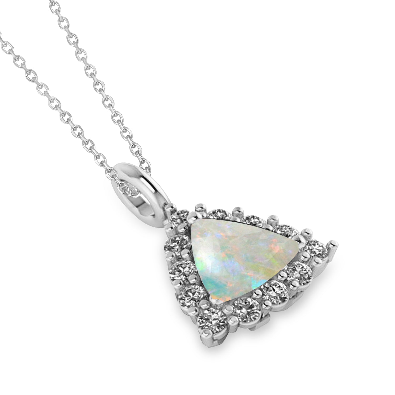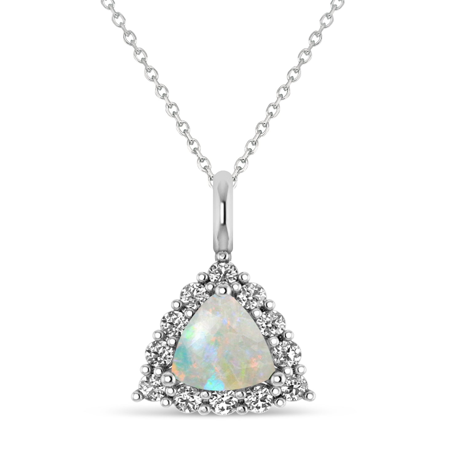 This pendant features a trillion cut diffused Opal framed by a diamond halo diamond accents on the pendant loop. This pendant necklace is set in 14k White Gold, has a total weight of 1.24ct., and comes along with your choice of a 16 or 18 inch long matching gold chain.