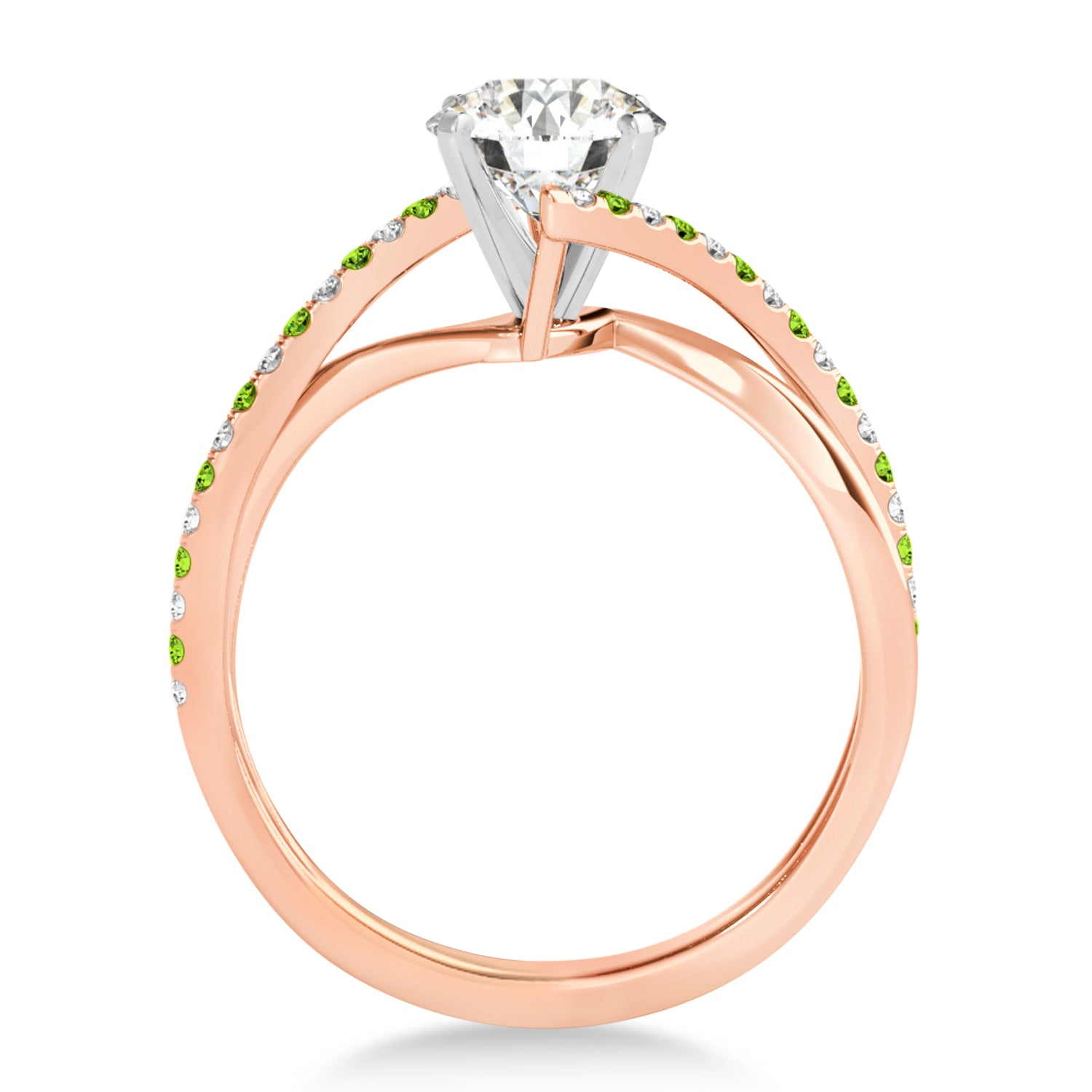 This unique bypass engagement ring setting has a twisted band containing a total of 34 alternating Peridots & Diamonds on the ring's shank. The diamonds are of G-H color and SI1-SI2 clarity.
