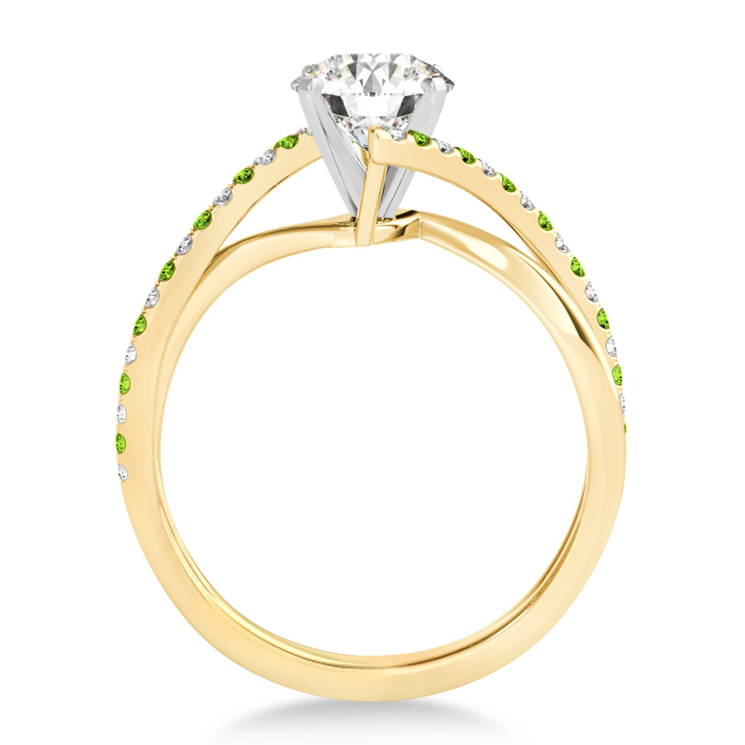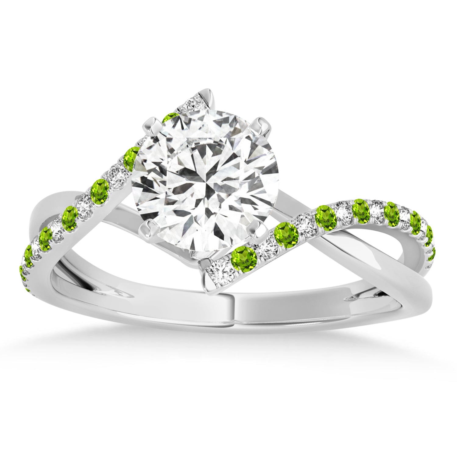This unique bypass engagement ring setting has a twisted band containing a total of 34 alternating Peridots & Diamonds on the ring's shank. The diamonds are of G-H color and SI1-SI2 clarity.