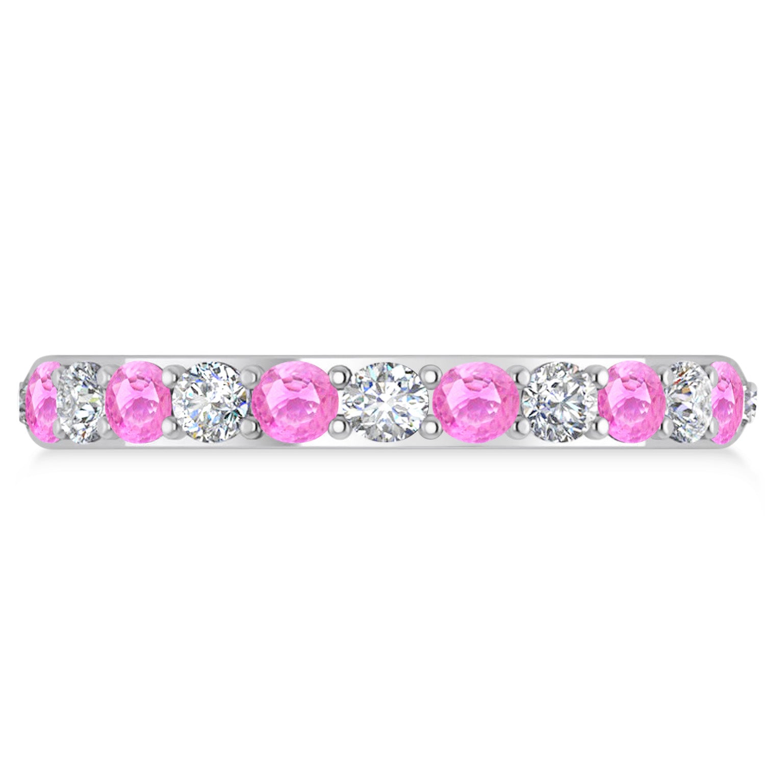 Set in 14k white gold, 12, prong-set, round diamonds and 12, prong-set, round pink sapphires surround the entirety of the wedding band, in a breathtakingly unique style.