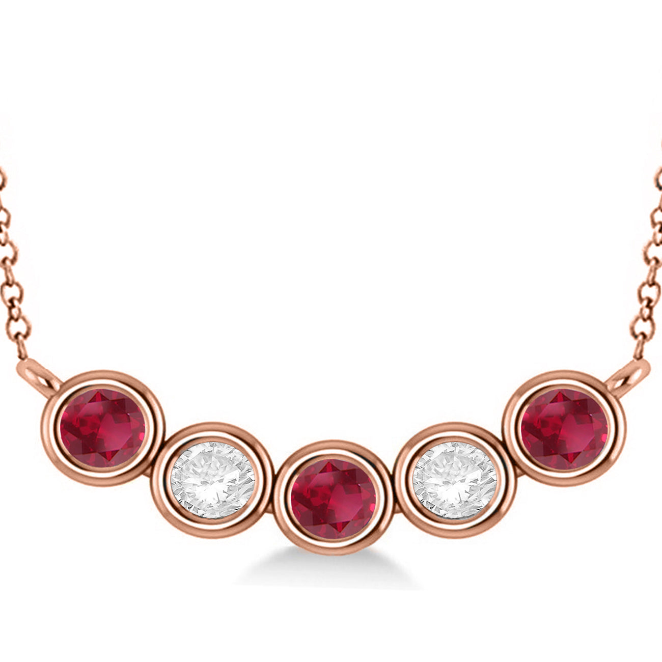 Crafted in striking 14k rose gold this bezel set five-stone Ruby & diamond necklace is absolutely gorgeous.