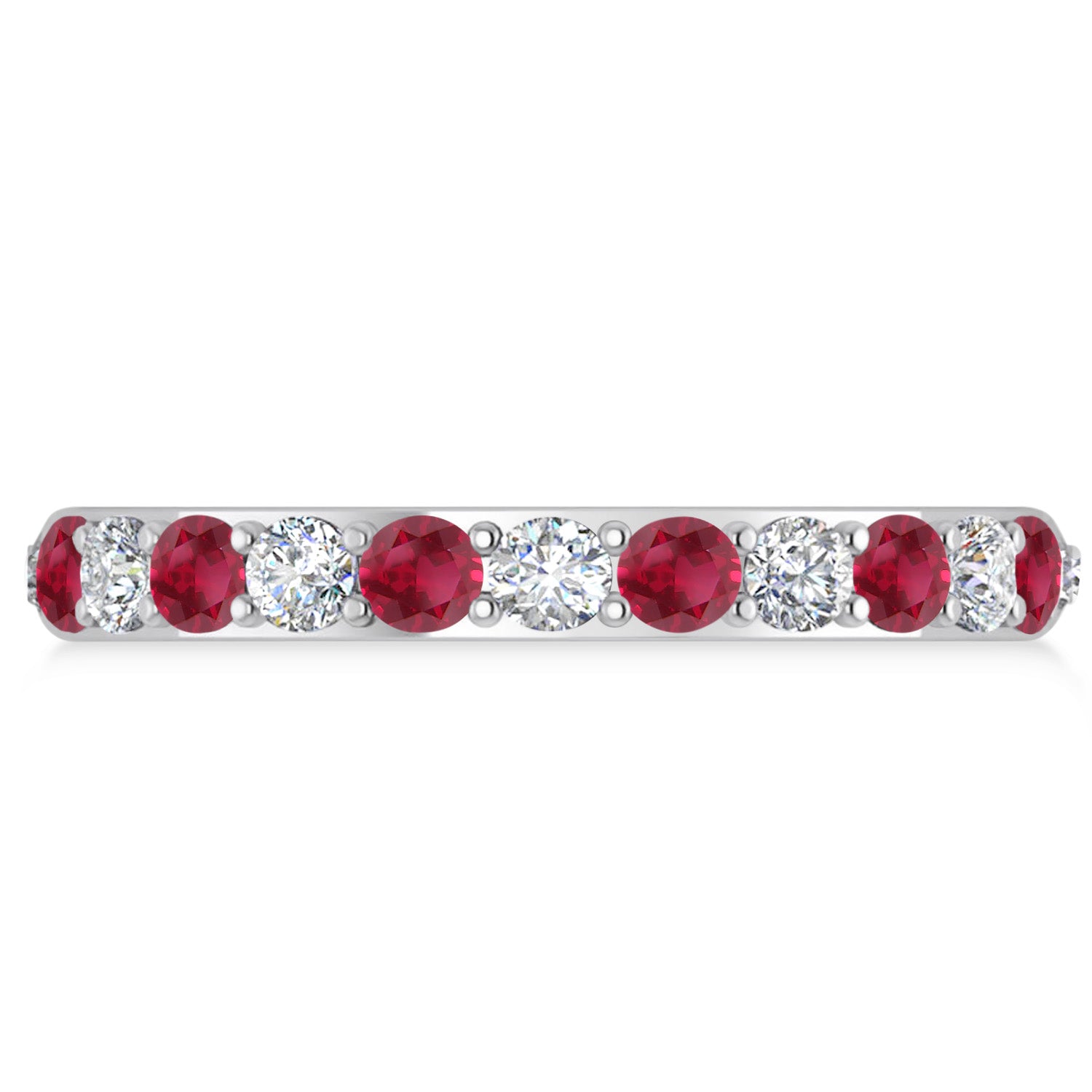 Set in 14k white gold, 12, prong-set, round diamonds and 12, prong-set, round rubies surround the entirety of the wedding band, in a breathtakingly unique style.