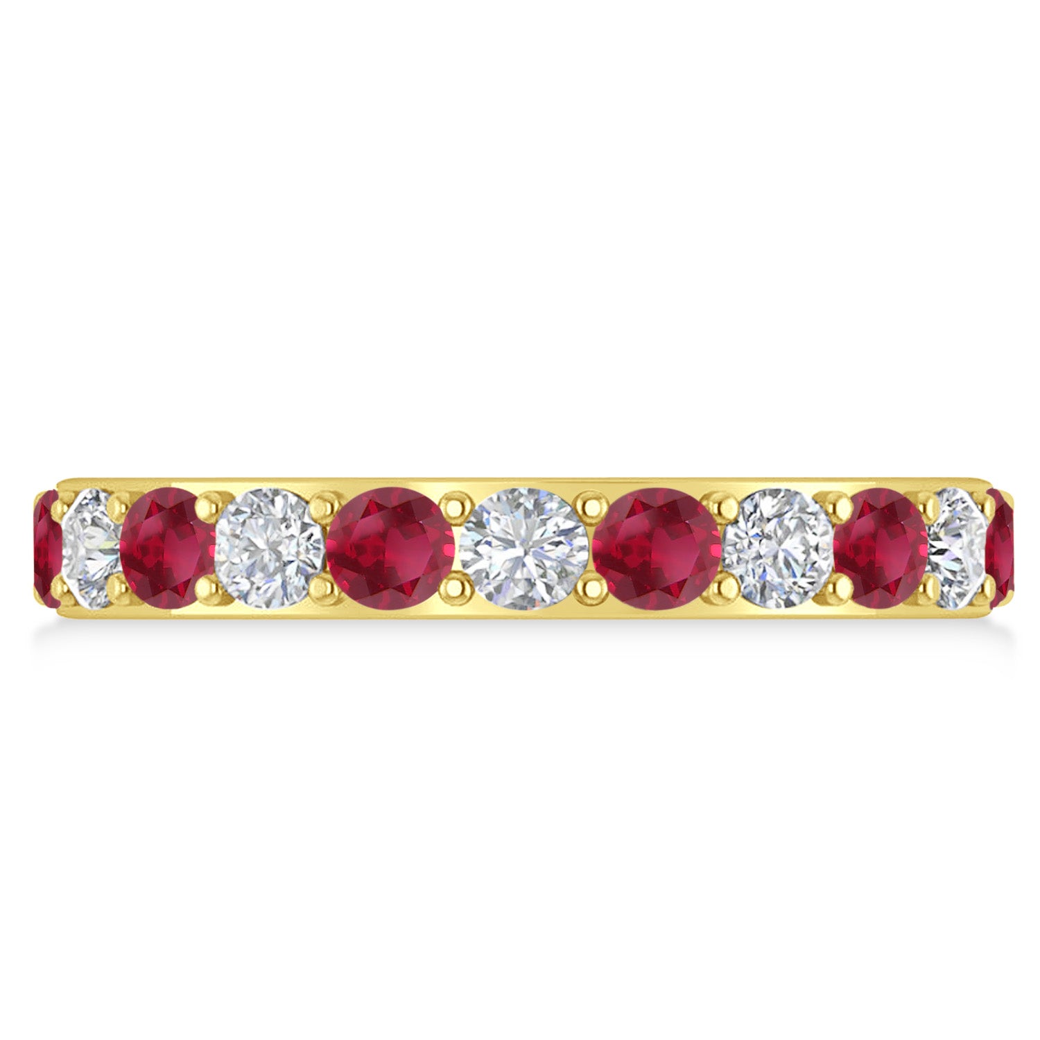 Set in 14k yellow gold, 11, prong-set, round diamonds and 11, prong-set, round rubies surround the entirety of the wedding band, in a breathtakingly unique style.