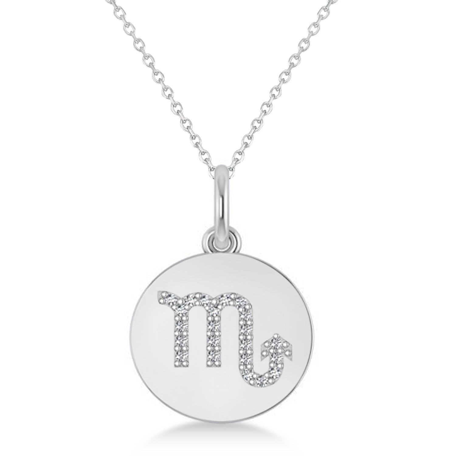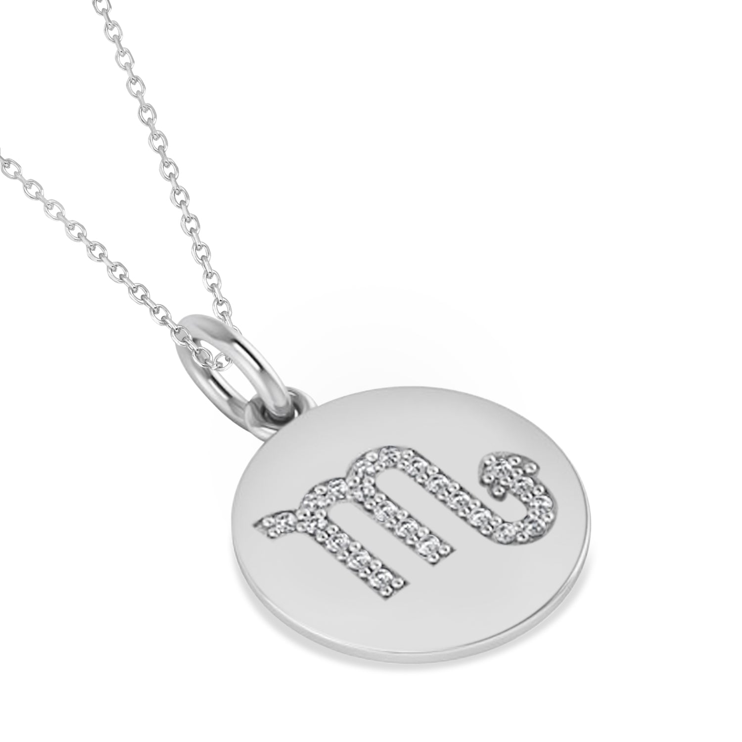 Our Diamond Scorpio Zodiac Disk pendant necklace is available in other metals. This diamond pendant necklace design is also available in the eleven other Zodiac signs, perfect for any Astrology fan.