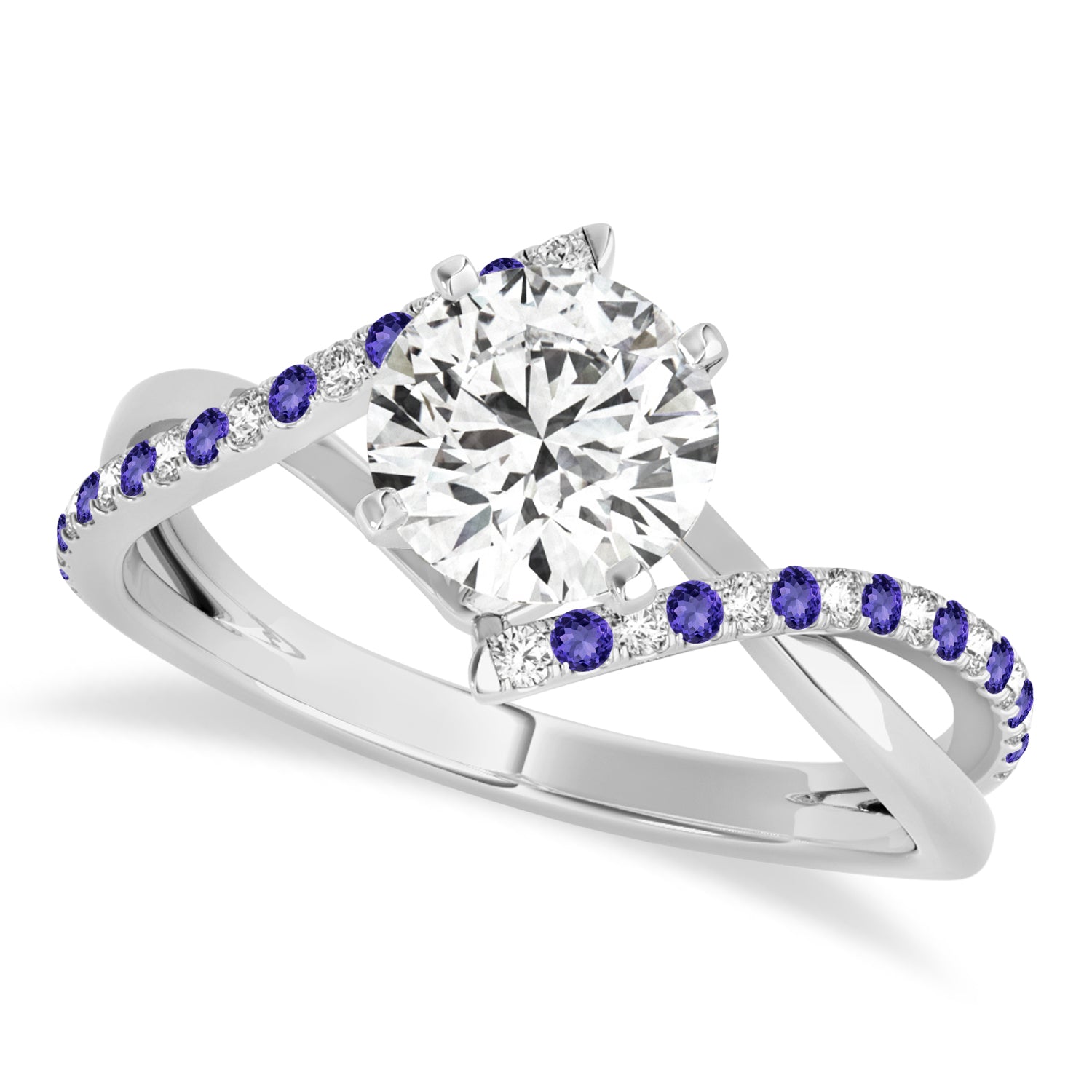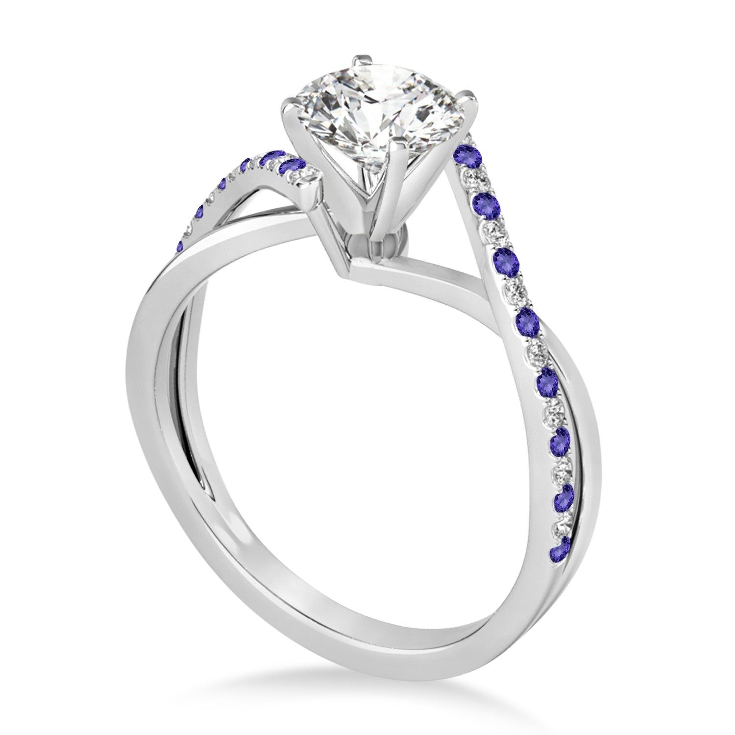 This unique bypass engagement ring setting has a twisted band containing a total of 34 alternating Tanzanites & Diamonds on the ring's shank. The diamonds are of G-H color and SI1-SI2 clarity.