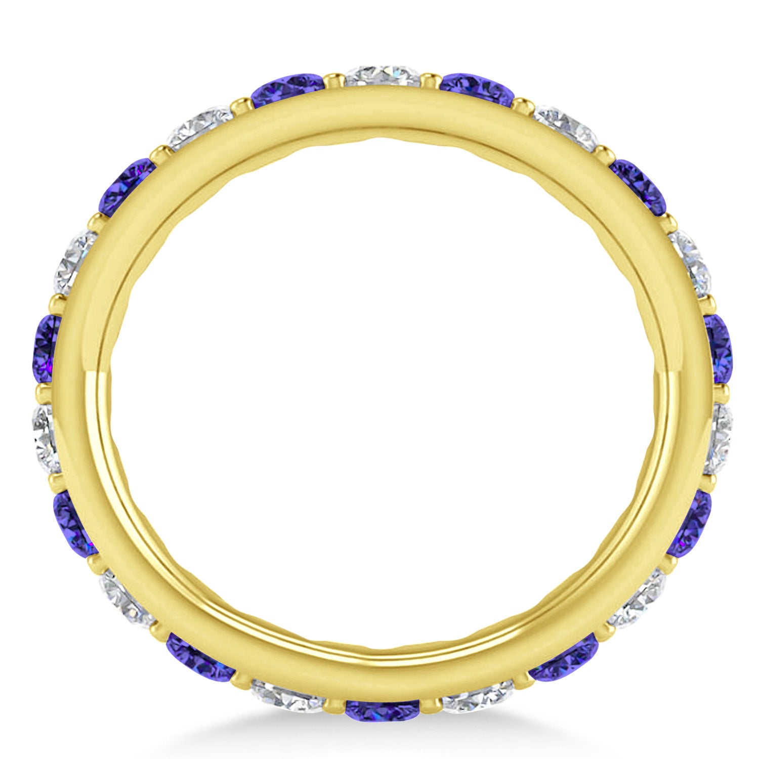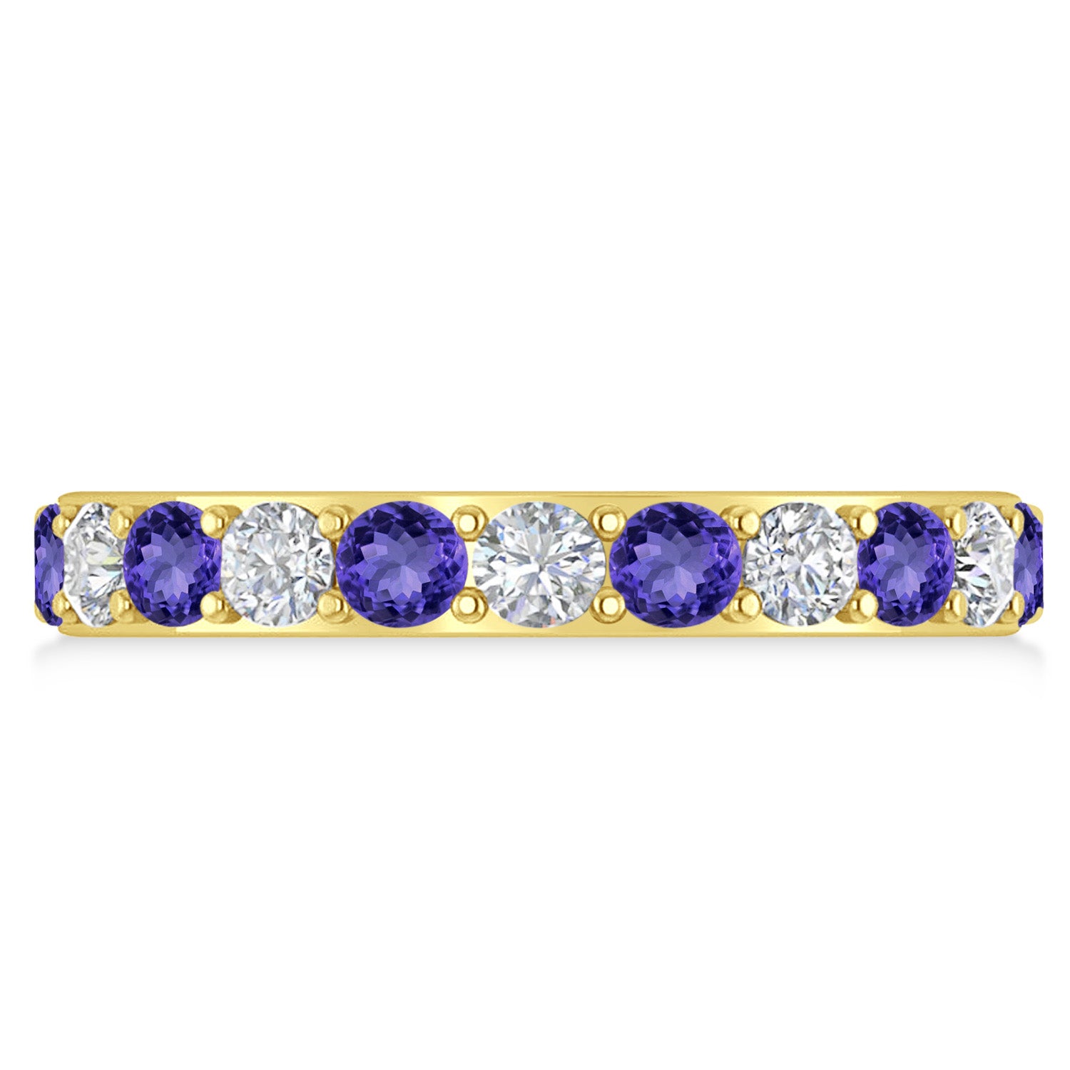 Set in 14k yellow gold, 11, prong-set, round diamonds and 11, prong-set, round tanzanites surround the entirety of the wedding band, in a breathtakingly unique style.