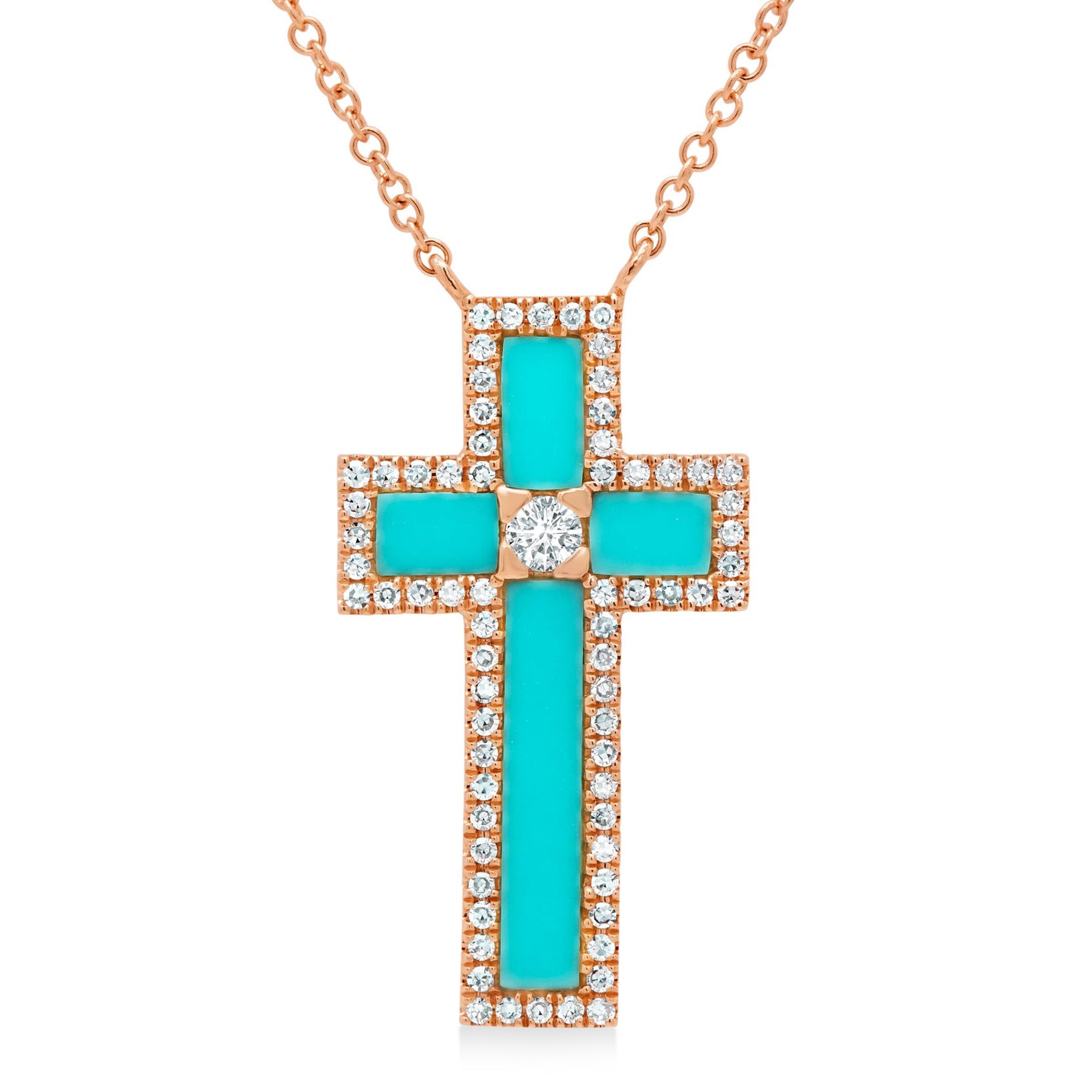 Adorn yourself with divine elegance with our Diamond & Composite Turquoise Cross Pendant Necklace. Crafted in lustrous 14K Rose Gold, this pendant showcases a captivating composite turquoise adorned with shimmering diamonds totaling 1.19 carats. Radiating grace and spirituality, this Pendant Necklace is a timeless symbol of faith and sophistication