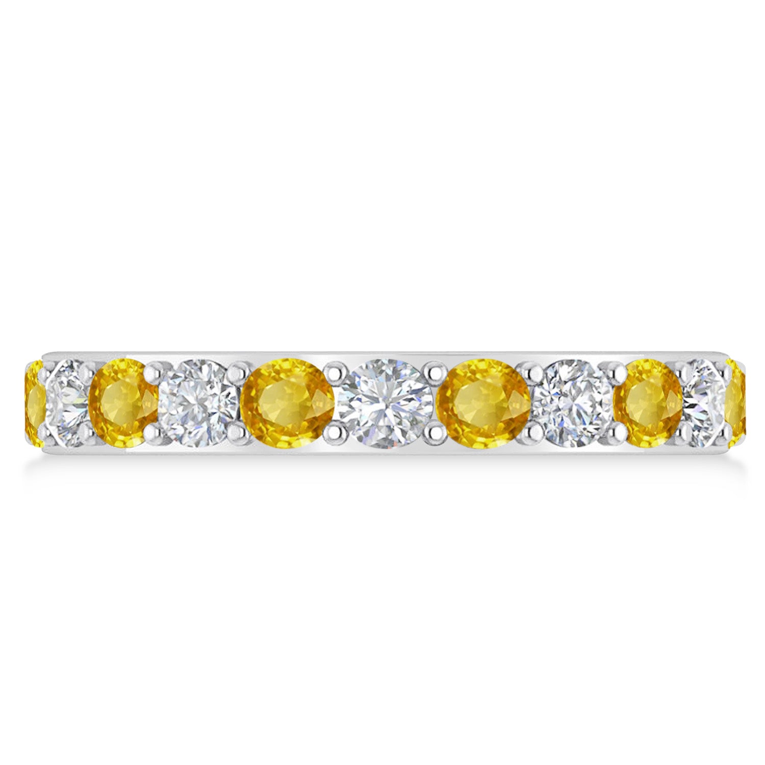 Set in 14k white gold, 11, prong-set, round diamonds and 11, prong-set, round yellow sapphires surround the entirety of the wedding band, in a breathtakingly unique style.