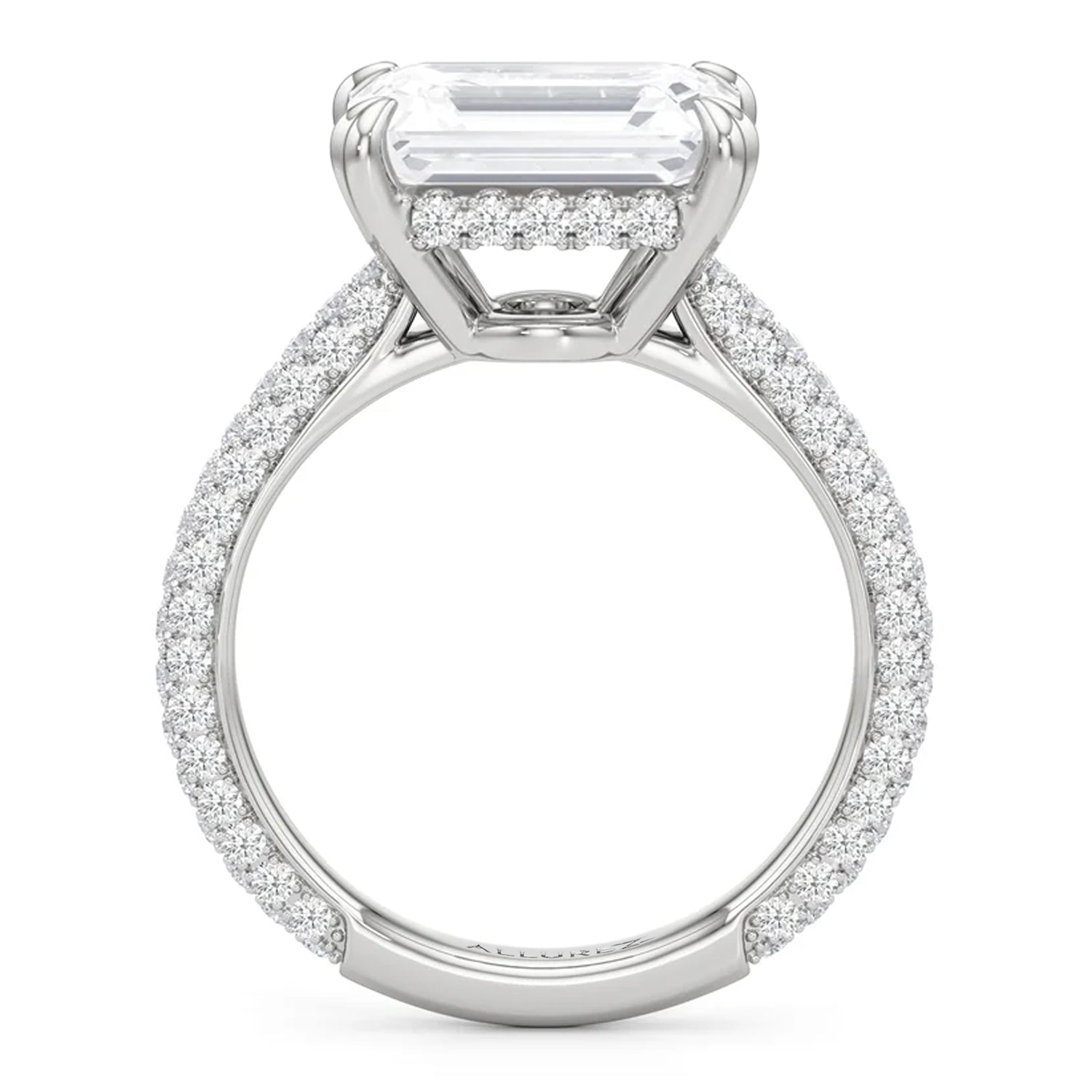 Sleek and sophisticated, this East West emerald lab diamond bridal set in 14K white gold blends modern design with timeless beauty. The engagement ring features a horizontally set emerald cut center stone accented by side stones, totaling 3.90ct, and is paired with a perfectly matched 0.87ct band. With a combined weight of 4.77 carats, this ethically crafted set radiates brilliance, elegance, and contemporary charm.