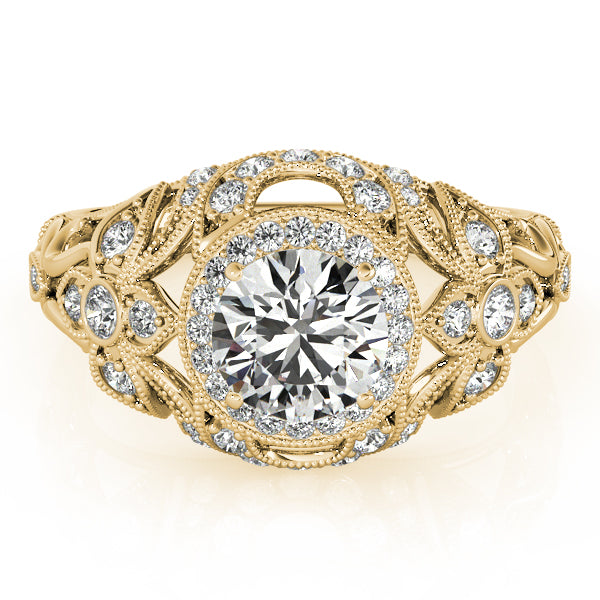 Set in 18k yellow gold, this vintage inspired diamond engagement ring features a unique floral design. With a total of 46 diamond accents, this Edwardian engagement ring features a halo framed center stone set in a vintage floral design, creating a unique engagement ring that's sure to please.
