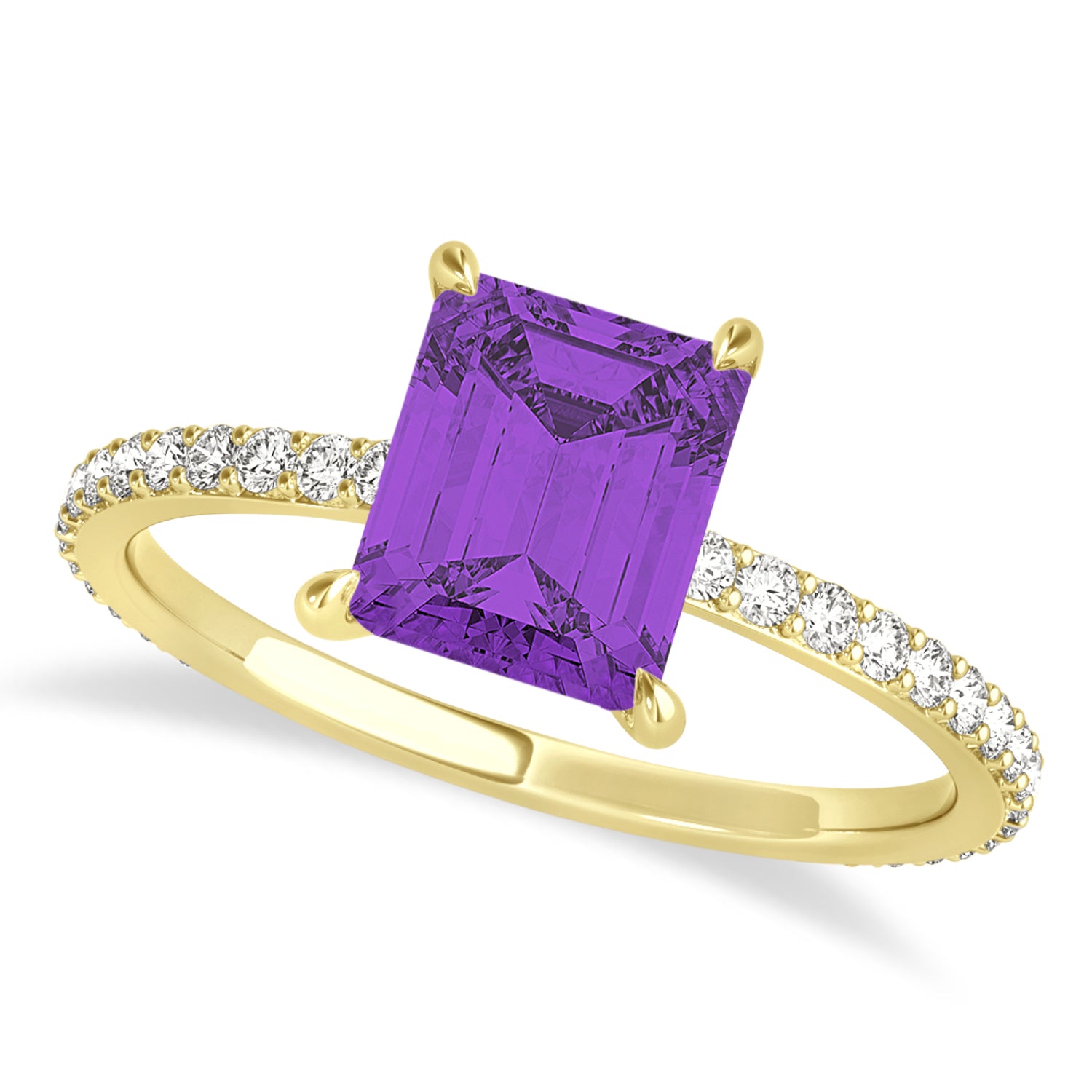 A 2.60 carat emerald-shaped Amethyst is prong set into 14k Yellow Gold in this preset hidden halo engagement ring. An abundance of prong diamond accents are featured in this ring that shine endlessly.