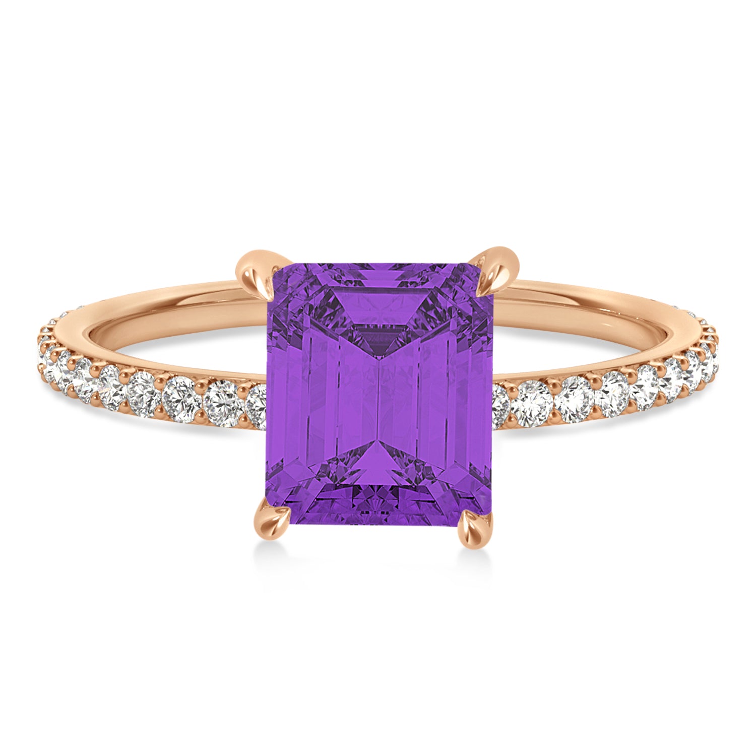 A 2.60 carat emerald-shaped Amethyst is prong set into 18k Rose Gold in this preset hidden halo engagement ring. An abundance of prong diamond accents are featured in this ring that shine endlessly.