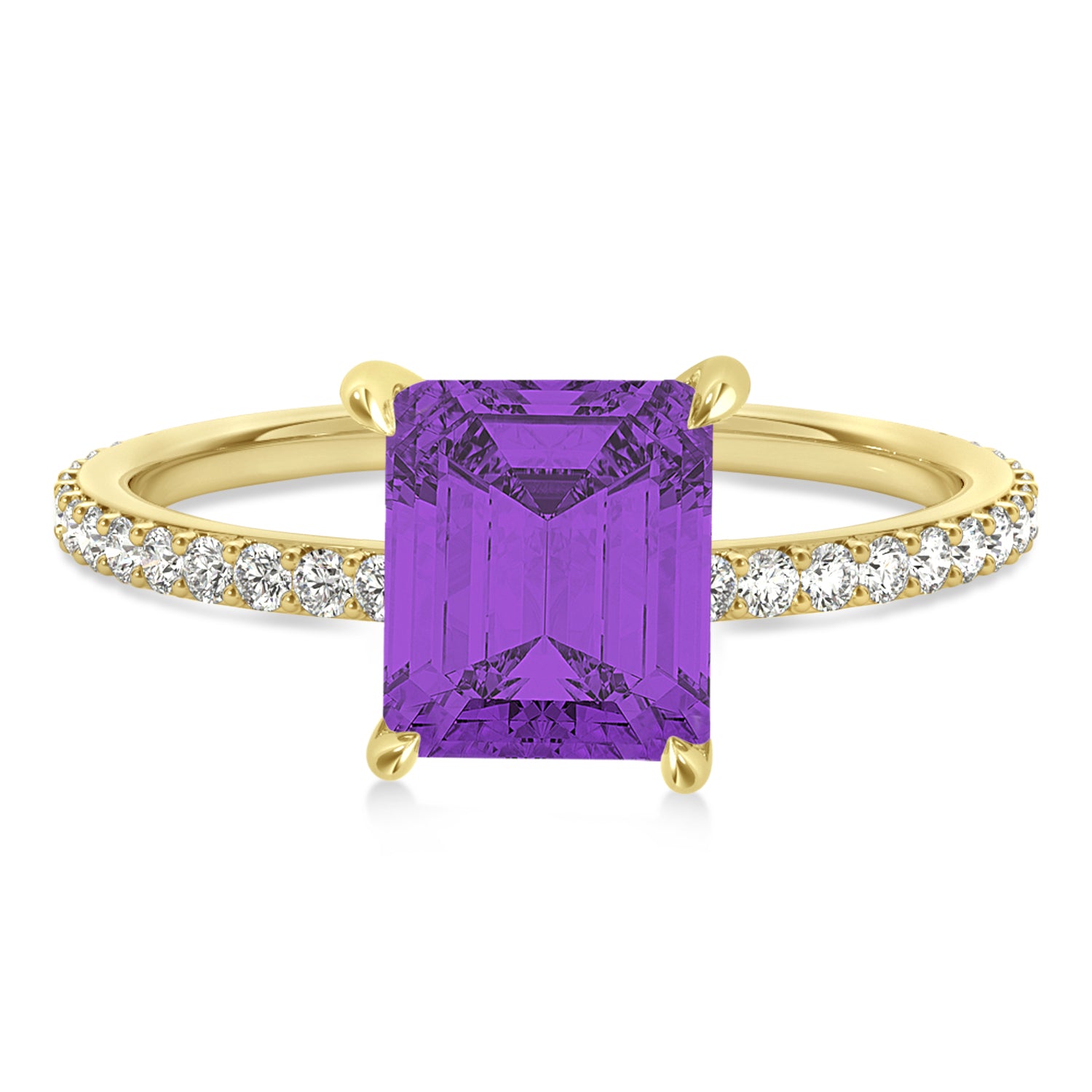 A 2.60 carat emerald-shaped Amethyst is prong set into 18k Yellow Gold in this preset hidden halo engagement ring. An abundance of prong diamond accents are featured in this ring that shine endlessly.
