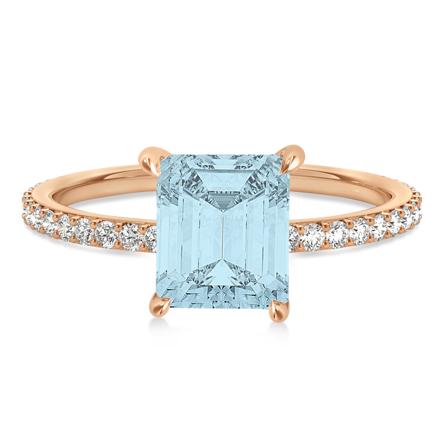 A 2.60 carat emerald-shaped Aquamarine is prong set into 14k Rose Gold in this preset hidden halo engagement ring. An abundance of prong diamond accents are featured in this ring that shine endlessly.