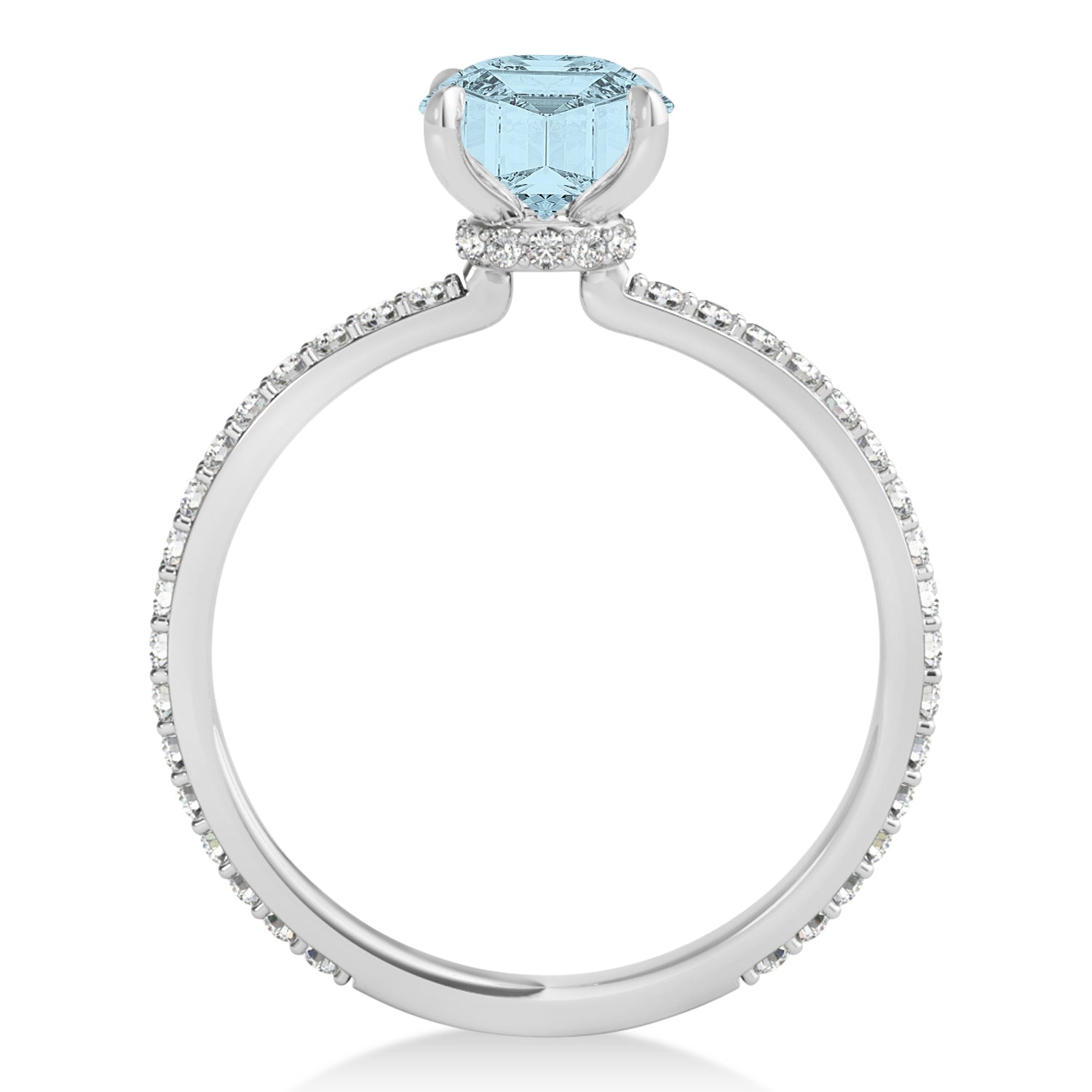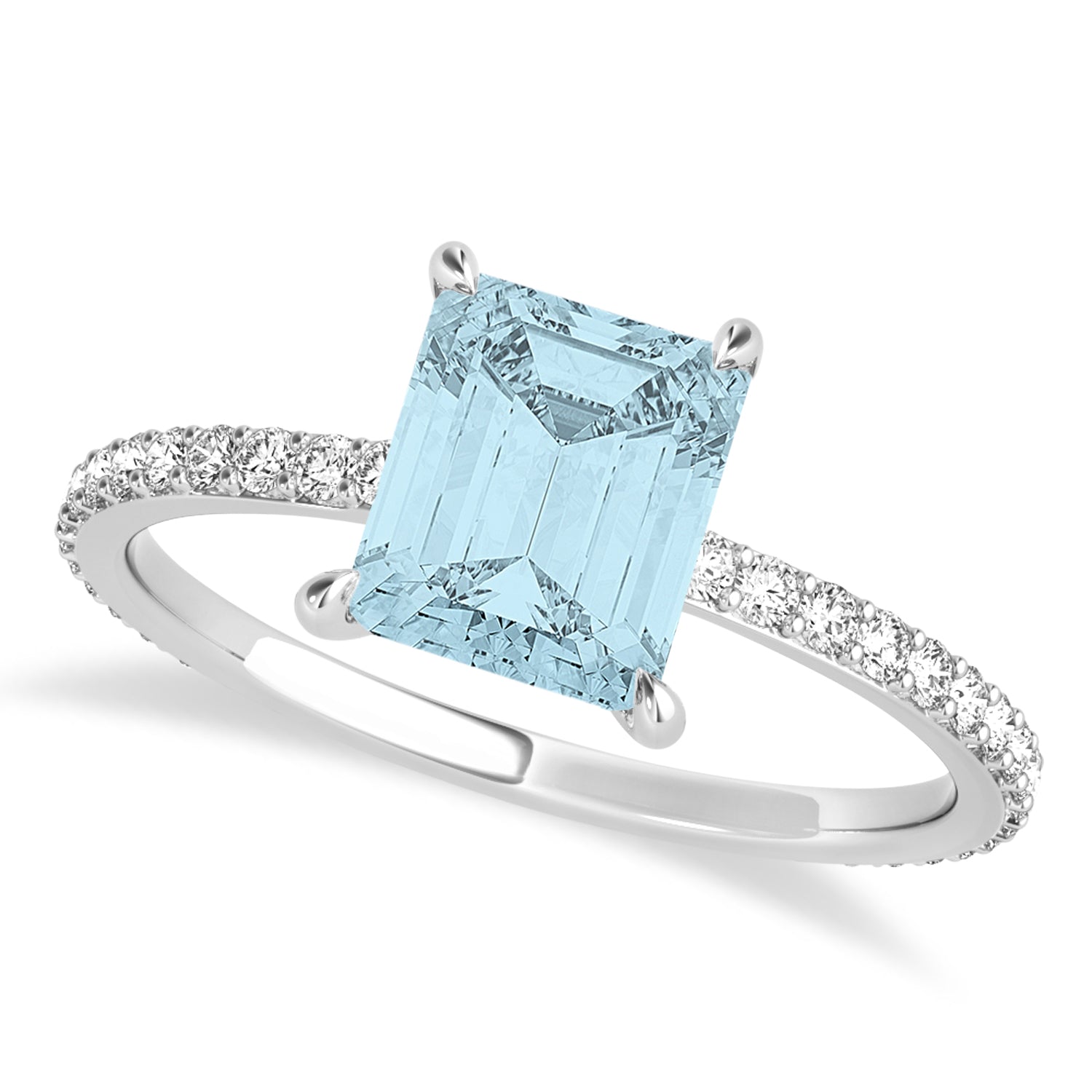 A 2.60 carat emerald-shaped Aquamarine is prong set into Palladium in this preset hidden halo engagement ring. An abundance of prong diamond accents are featured in this ring that shine endlessly.