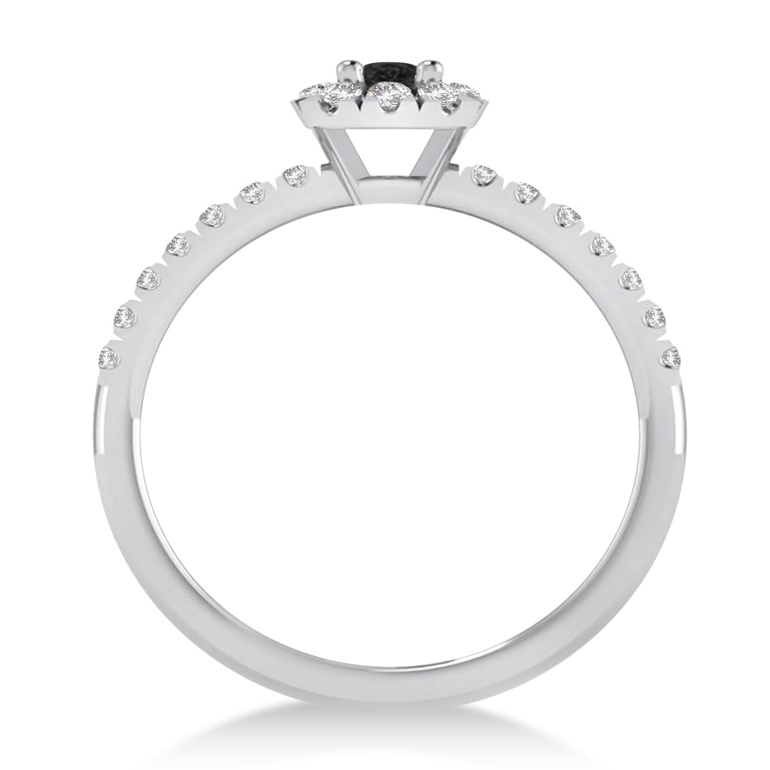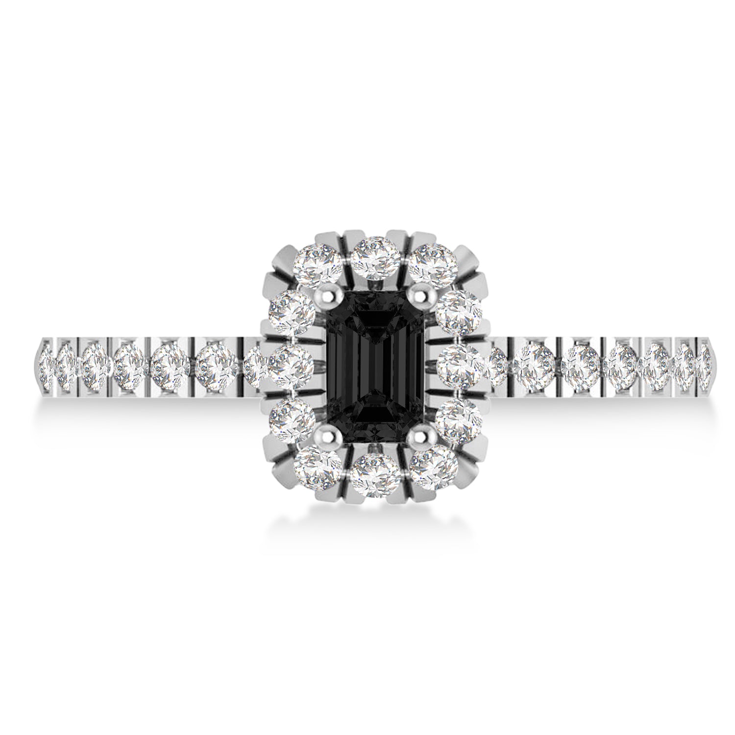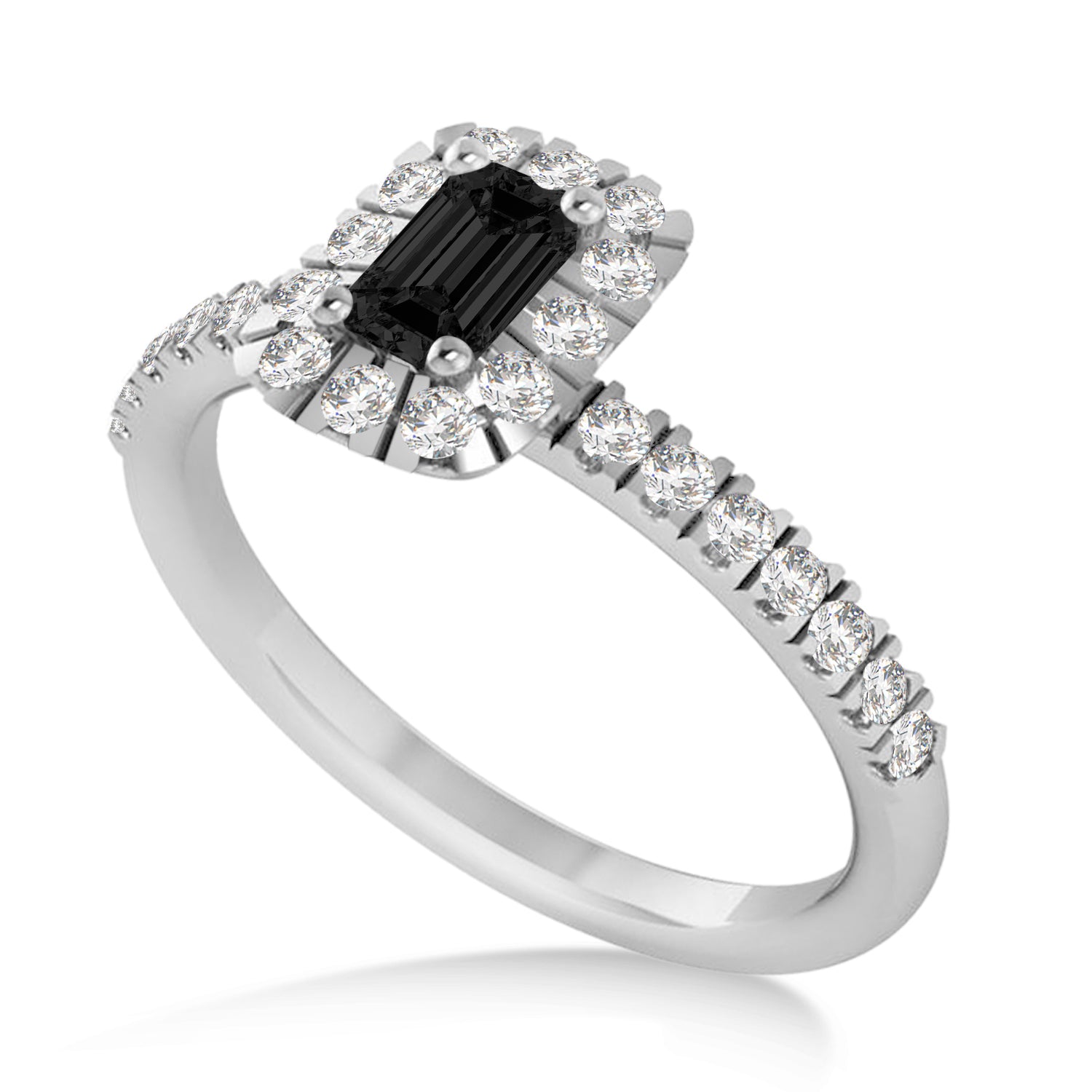 This eye-catching Black Diamond ring features 0.39ct total weight of encrusted diamonds on the thin 14k White Gold band, as well as surrounding a 1ct Emerald cut Black Diamond.