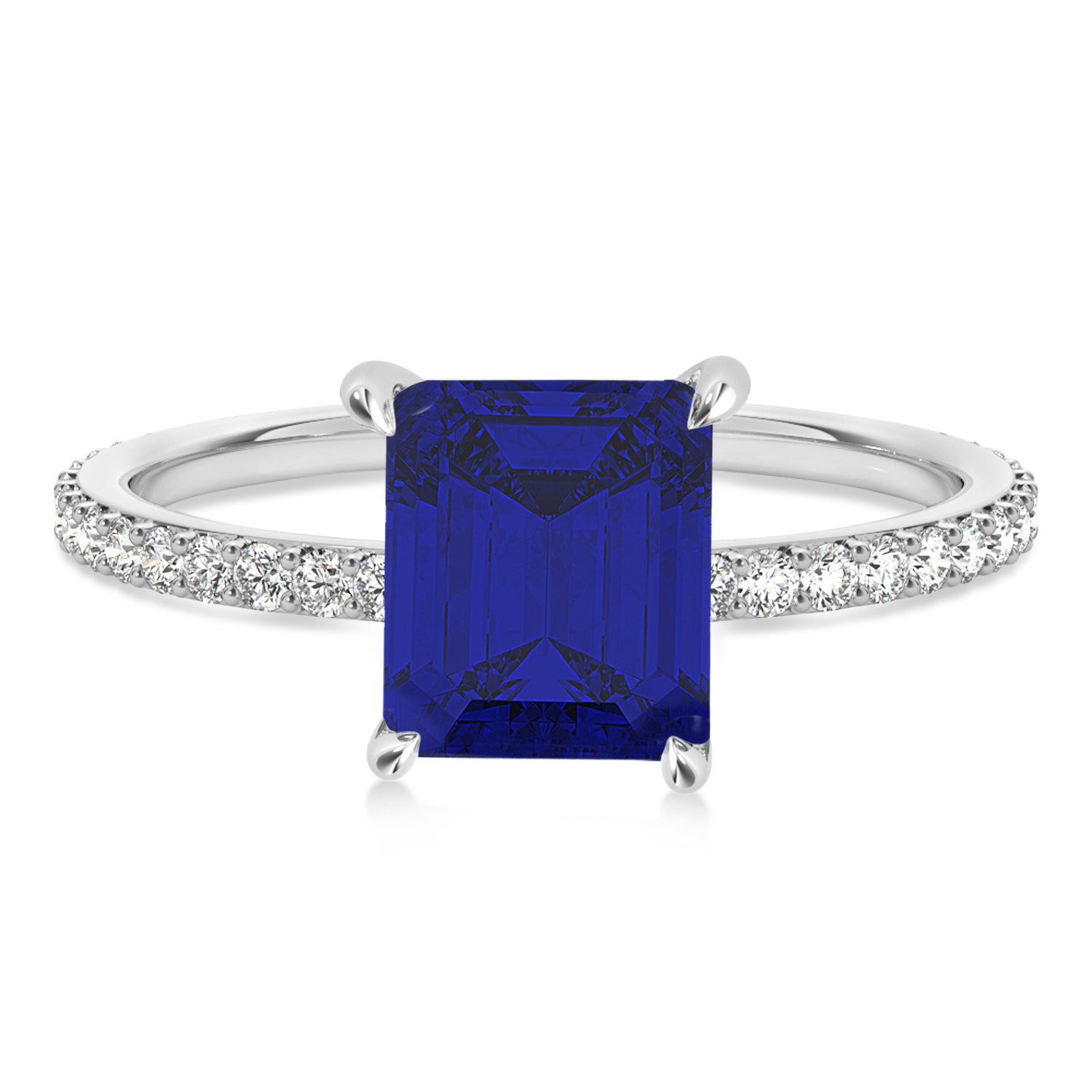 A 2.60 carat emerald-shaped Blue Sapphire is prong set into 18k White Gold in this preset hidden halo engagement ring. An abundance of prong diamond accents are featured in this ring that shine endlessly.
