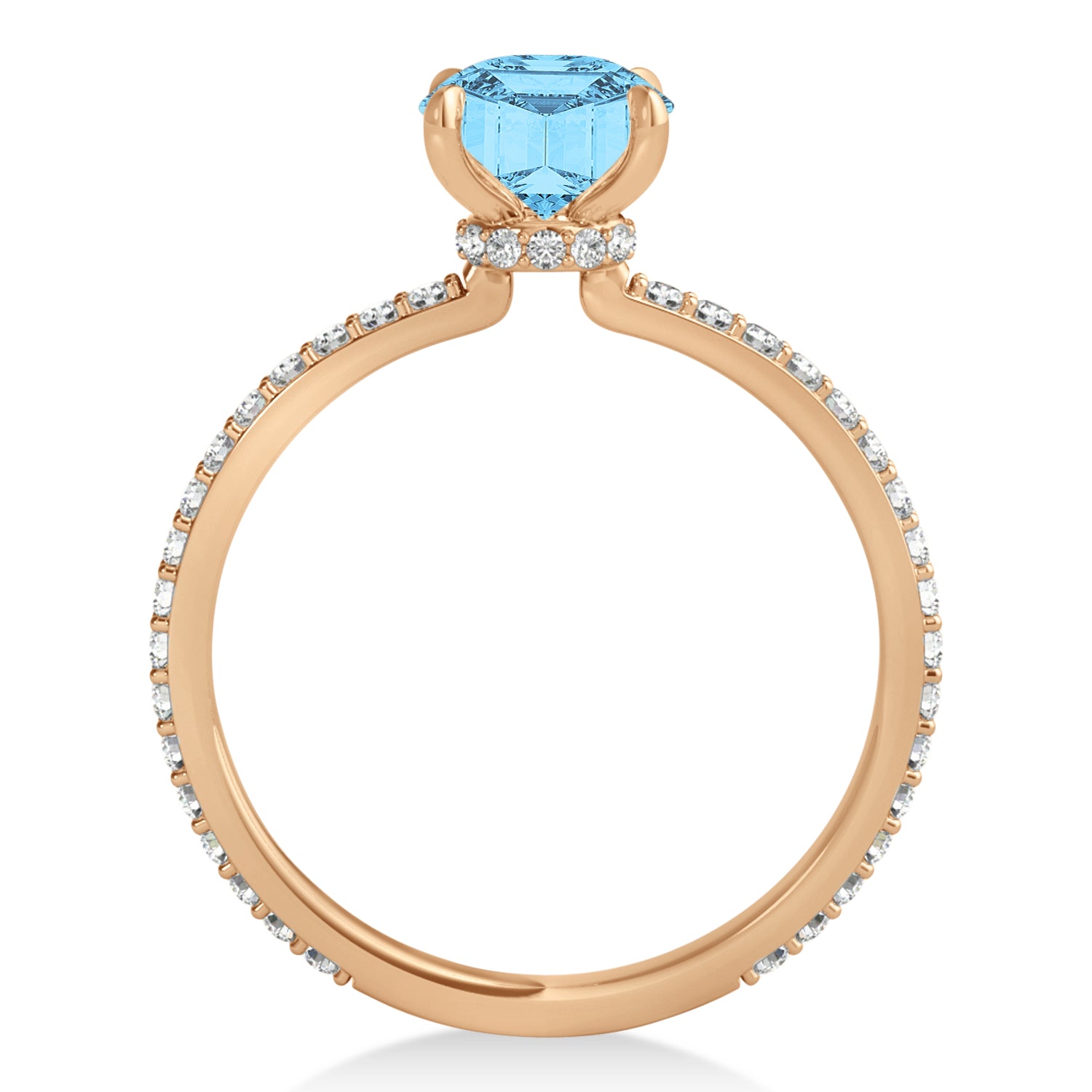 A 2.60 carat emerald-shaped Blue Topaz is prong set into 14k Rose Gold in this preset hidden halo engagement ring. An abundance of prong diamond accents are featured in this ring that shine endlessly.