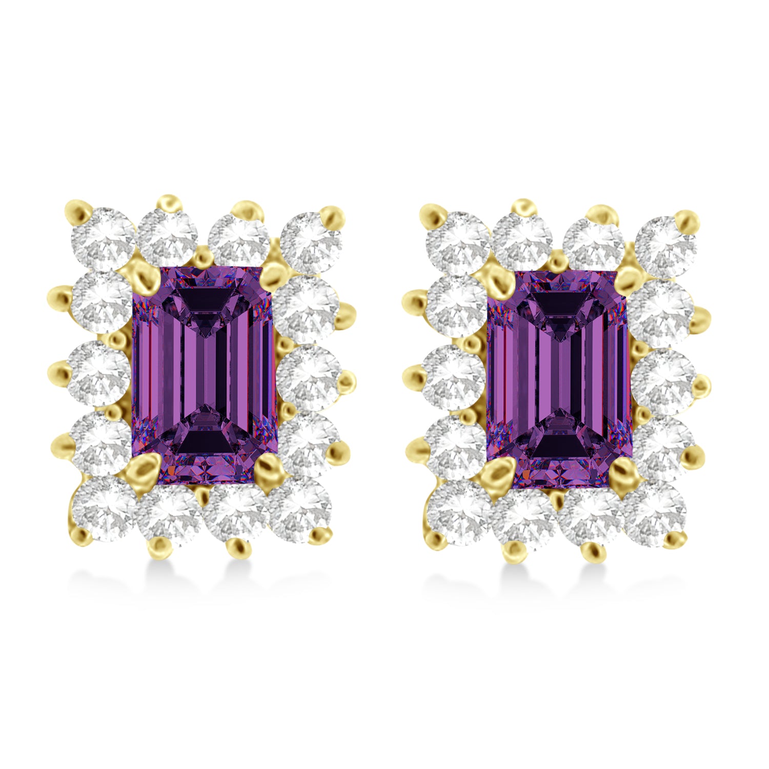 These unique designer studs feature two emerald-cut 6x4mm purple alexandrite precious gemstones, each accented by 14 brilliant cut round diamonds in a halo fashion. The fancy cut colored gemstones are genuine and natural. The diamonds that accent it are of near-colorless G-H Color and SI Clarity.
