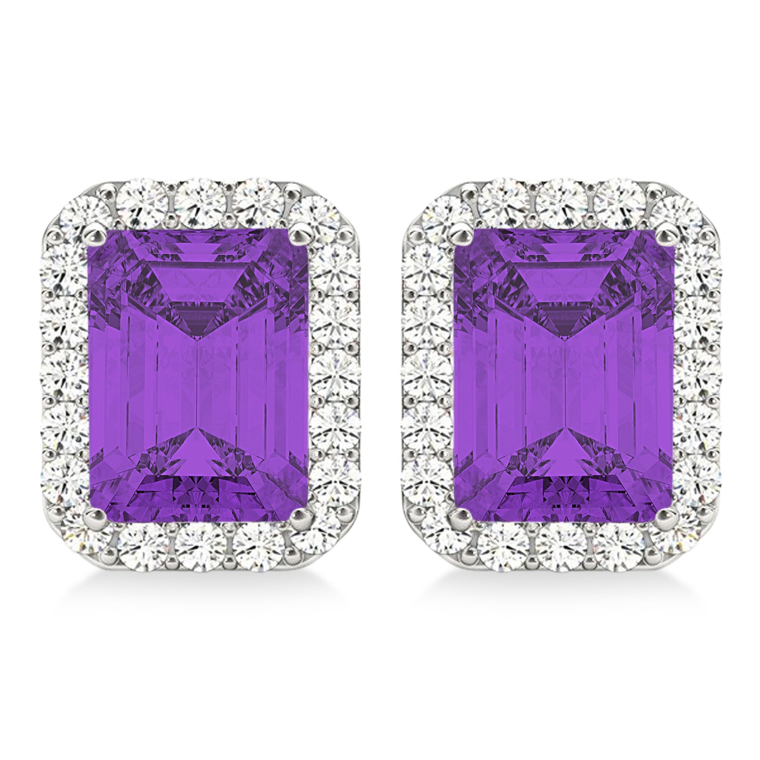 Dress up any outfit with these gorgeous 14k white gold emerald-cut amethyst and diamond halo earrings.