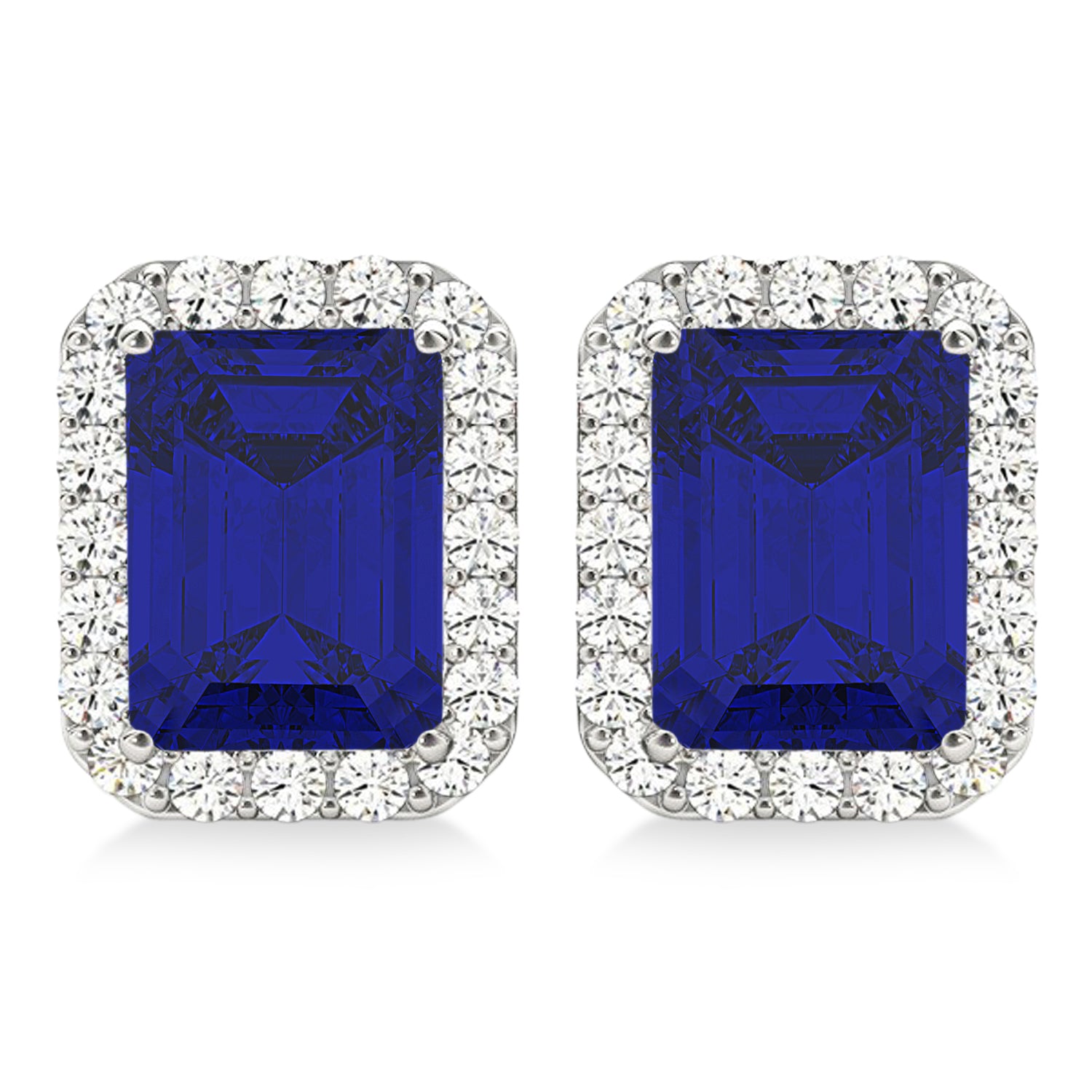 Emerald Cut Blue Sapphire & Diamond Halo Earrings 14k White Gold (2.60