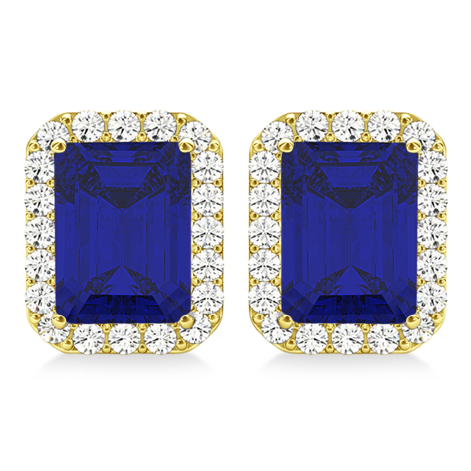 Dress up any outfit with these gorgeous 14k yellow gold emerald-cut blue sapphire and diamond halo earrings.