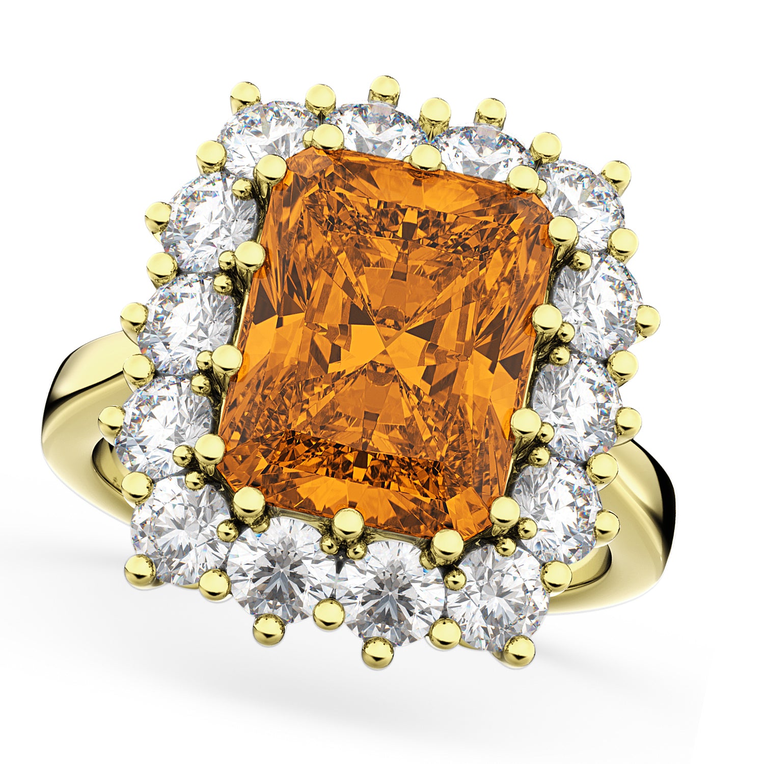 Emerald Cut Citrine & Diamond Lady Di Ring 14k Yellow Gold 5.68ct