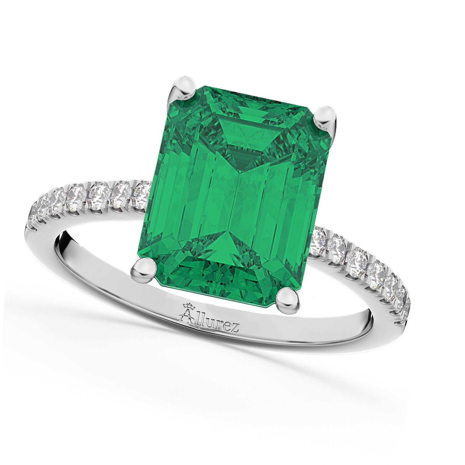 Make all the other women green with envy when you propose to your girlfriend with this emerald cut emerald sidestone accented engagement ring with diamond accents.