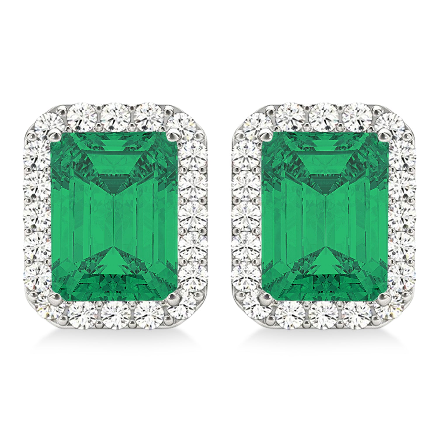 Emerald Cut Lab Emerald & Diamond Halo Earrings 14k White Gold (2.10ct)