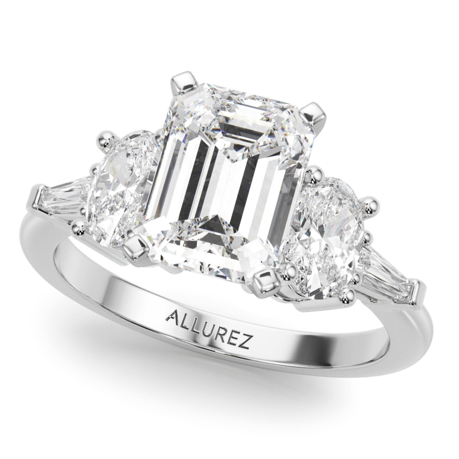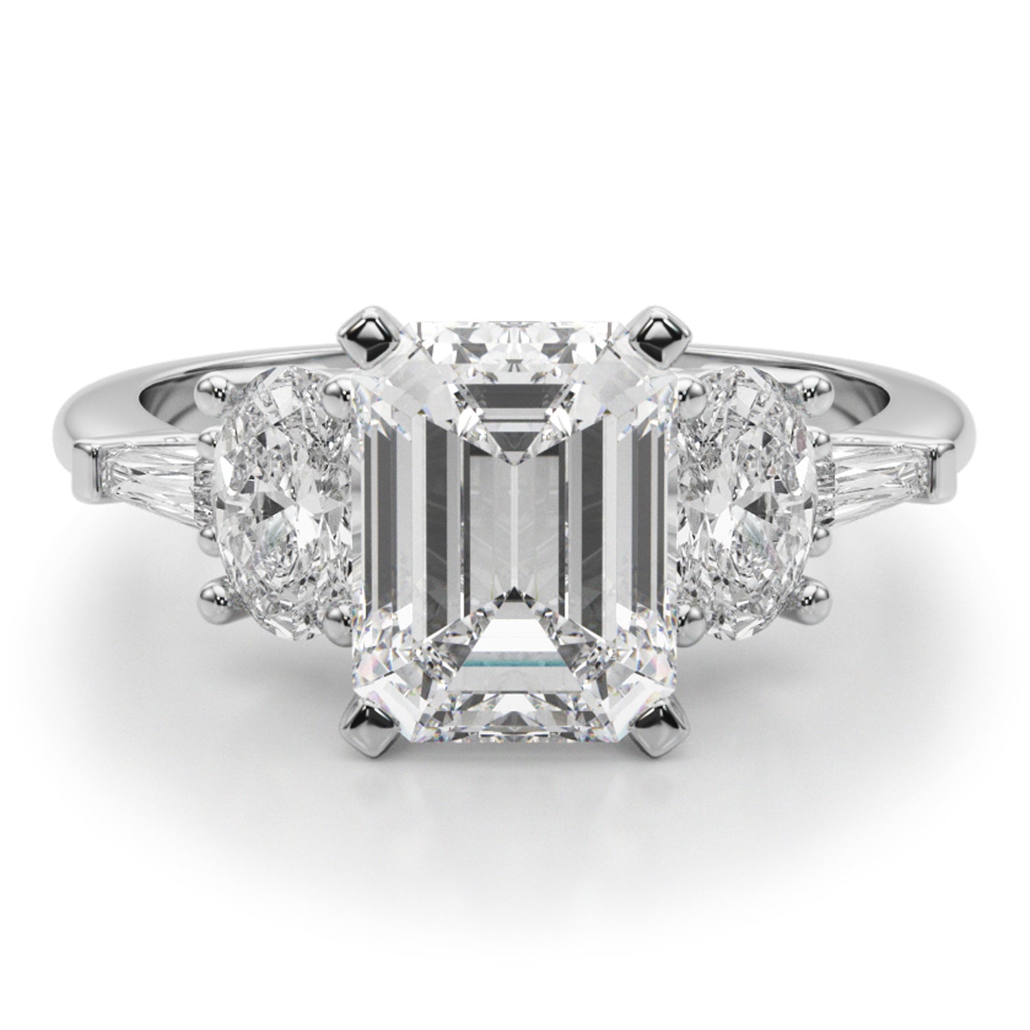 Discover the elegance of the Emerald Cut Lab Grown Diamond Engagement Ring, meticulously crafted in 14K White Gold, showcasing a stunning 4.18-carat brilliance. The centerpiece is a breathtaking 3-carat Emerald Cut diamond, surrounded by two oval 0.50-carat side stones (5.8x4.1mm) and two taper baguette 0.09-carat accent stones (4.02x1.5mm).