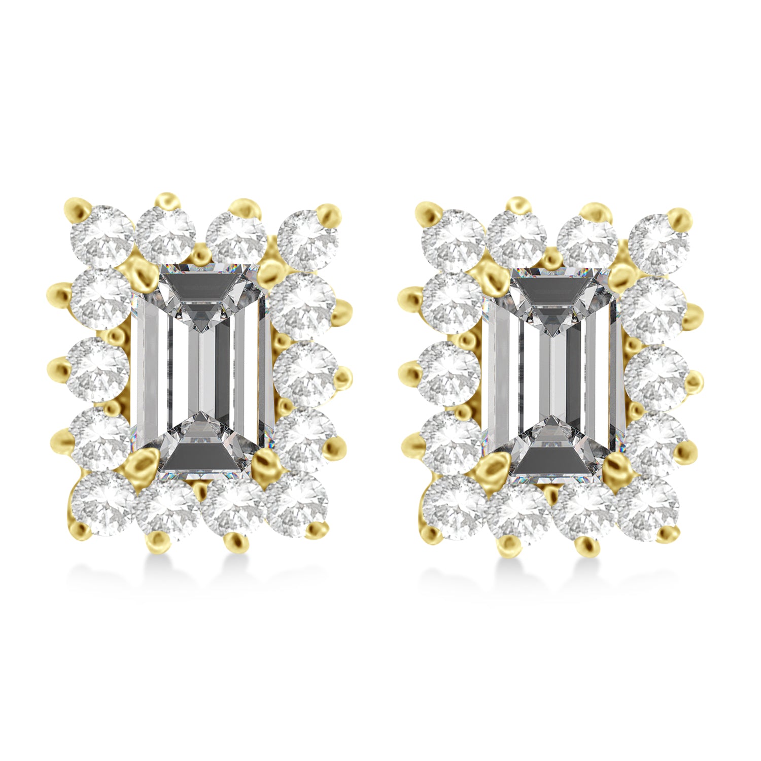 These unique designer studs feature two emerald-cut 6x4mm white moissanite precious gemstones, each accented by 14 brilliant cut round diamonds in a halo fashion. The fancy cut colored gemstones are genuine and natural. The diamonds that accent it are of near-colorless G-H Color and SI Clarity.