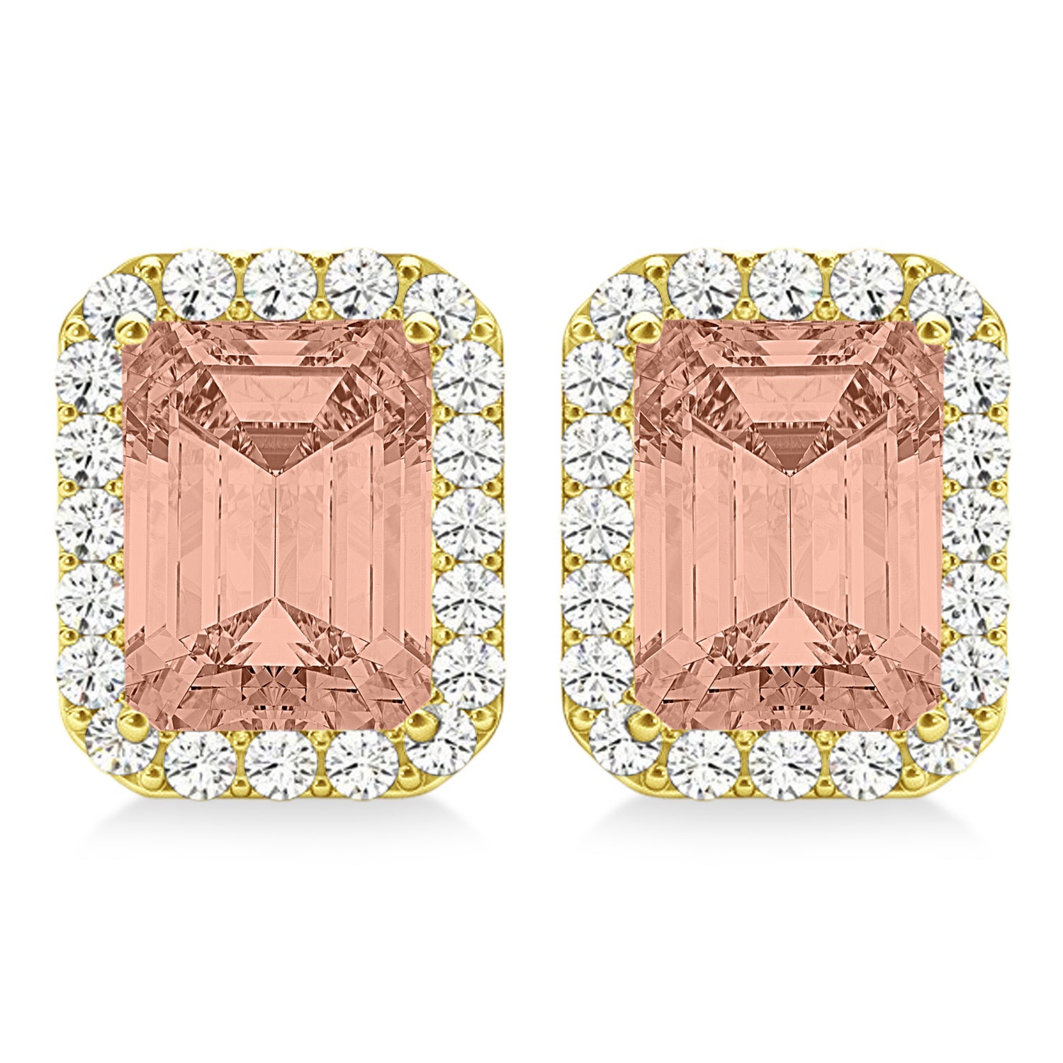 Dress up any outfit with these gorgeous 14k yellow gold emerald-cut morganite and diamond halo earrings.