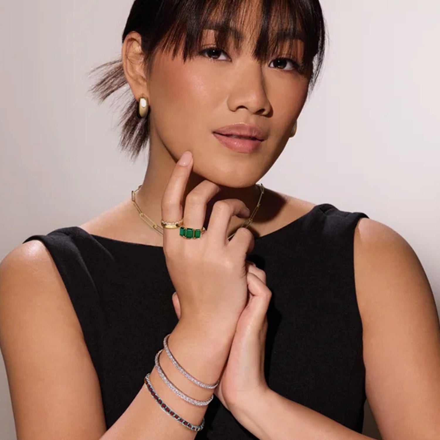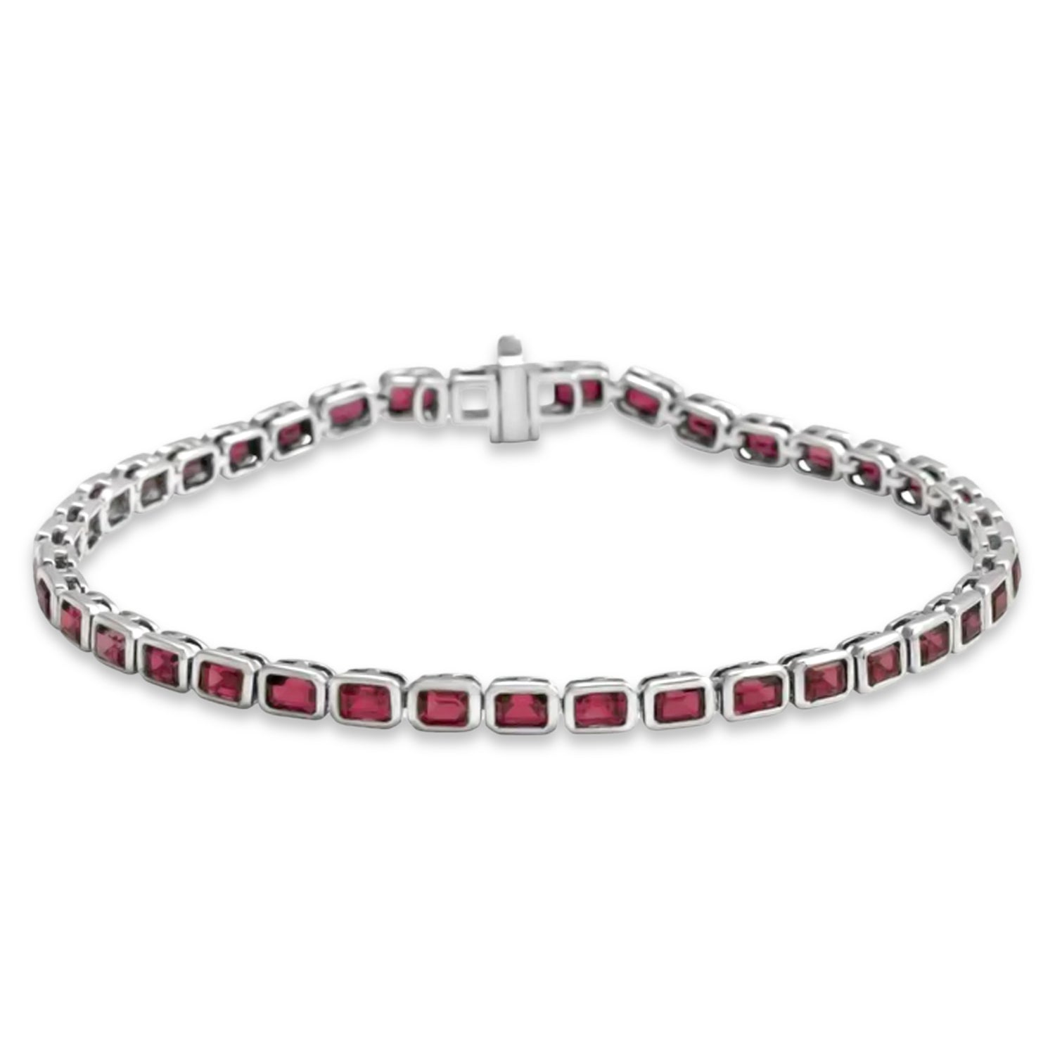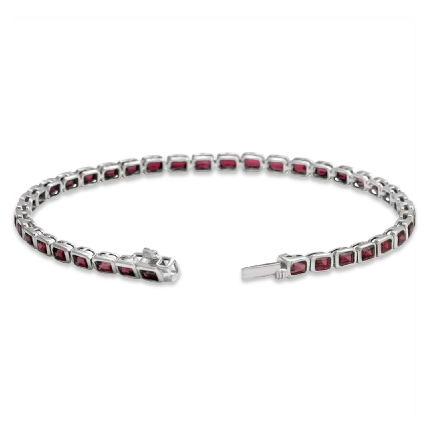 The Emerald Cut Garnet Tennis Bracelet shines with elegance in 14K white gold and is rhodium-plated for a polished finish.