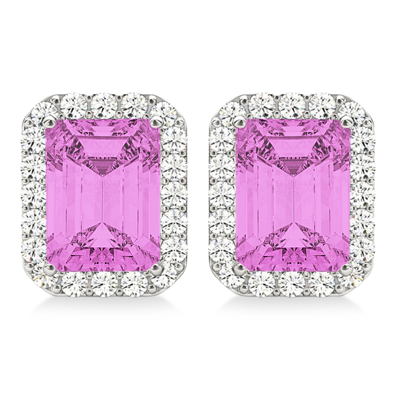 Dress up any outfit with these gorgeous 14k white gold emerald-cut pink sapphire and diamond halo earrings.