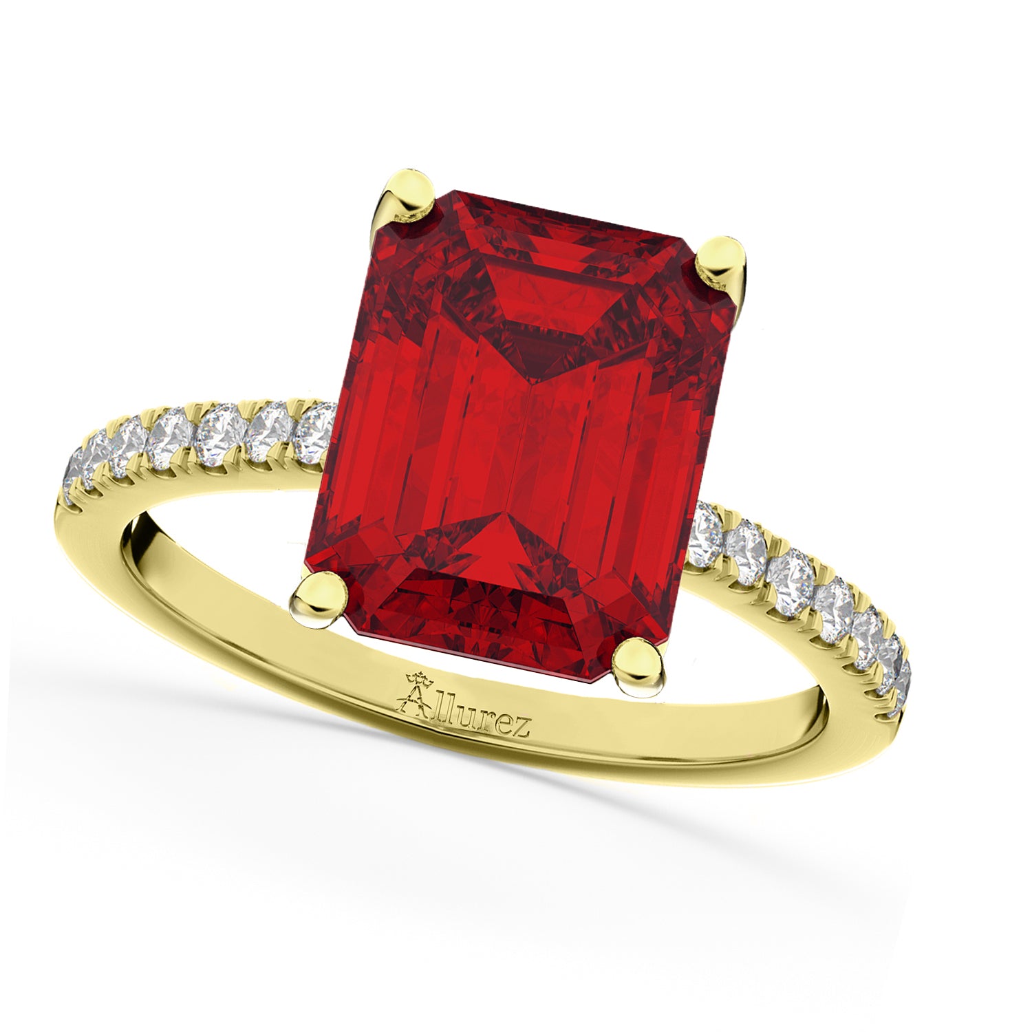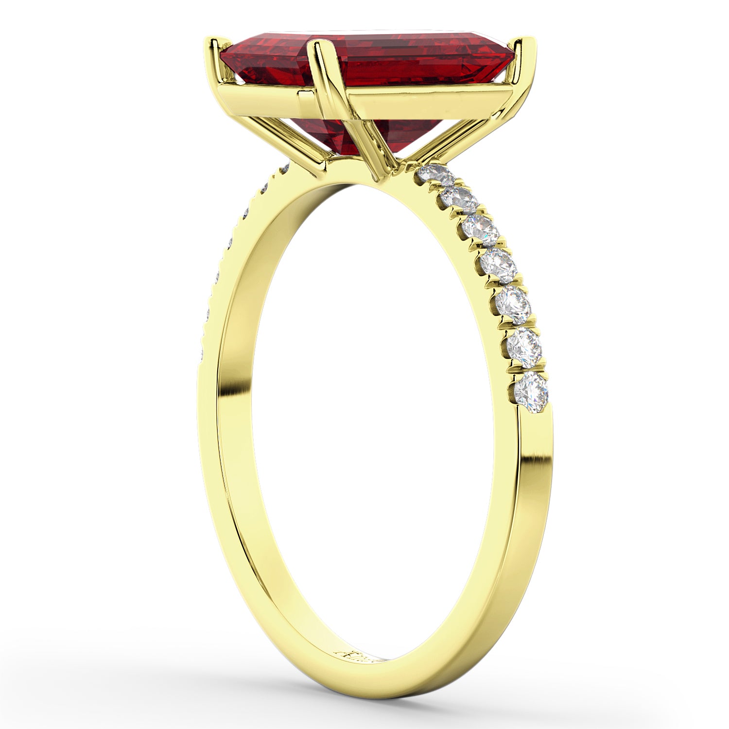 If your girl likes to stand out in a crowd, then this emerald cut ruby and diamond sidestone accented engagement ring will be ideal for your special day.