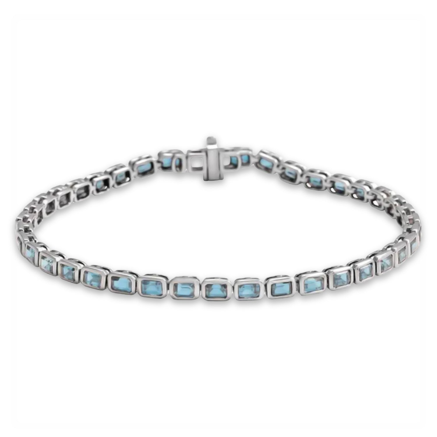 Featuring Sky Blue Topaz stones in bezel settings, this solid line bracelet showcases 8.58ct of pure sophistication. Its box clasp ensures a secure yet stylish fit, while the sleek design makes it a timeless addition to your jewelry collection.