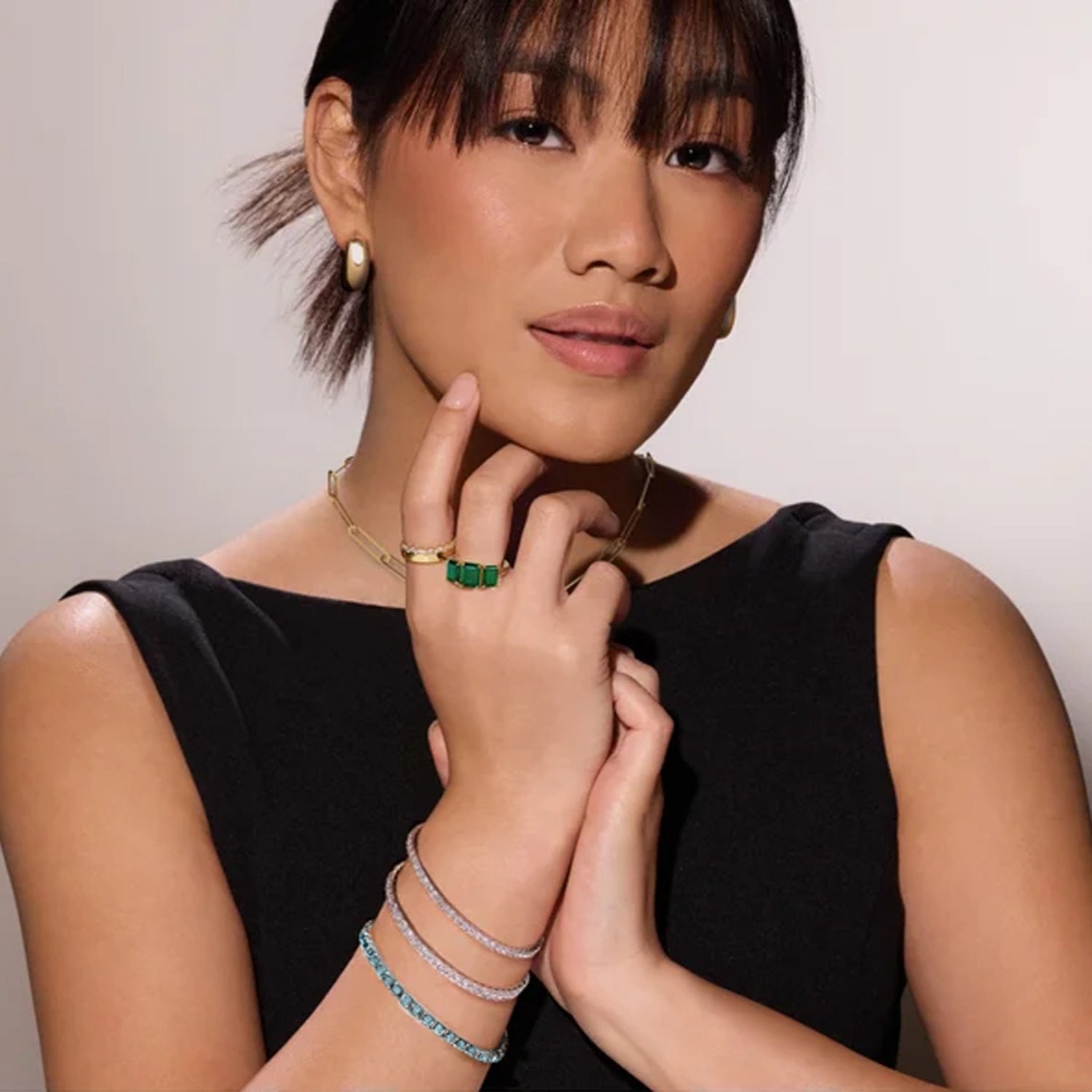 The Emerald Cut Sky Blue Topaz Tennis Bracelet shines with elegance in 14K white gold and is rhodium-plated for a polished finish.