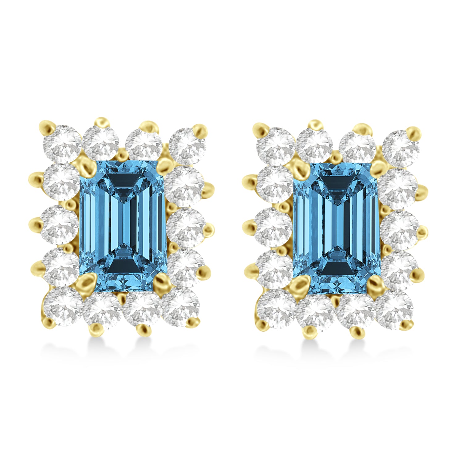 These unique designer studs feature two emerald-cut 6x4mm blue topaz precious gemstones, each accented by 14 brilliant cut round diamonds in a halo fashion. The fancy cut colored gemstones are genuine and natural. The diamonds that accent it are of near-colorless G-H Color and SI Clarity.