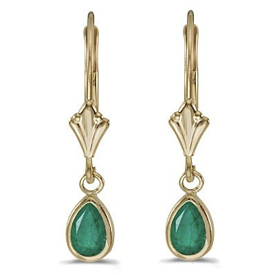 In each 14Kt yellow gold dangle earring, a 6x4mm genuine natural pear-shaped Emerald is beautifully set in a bezel setting.