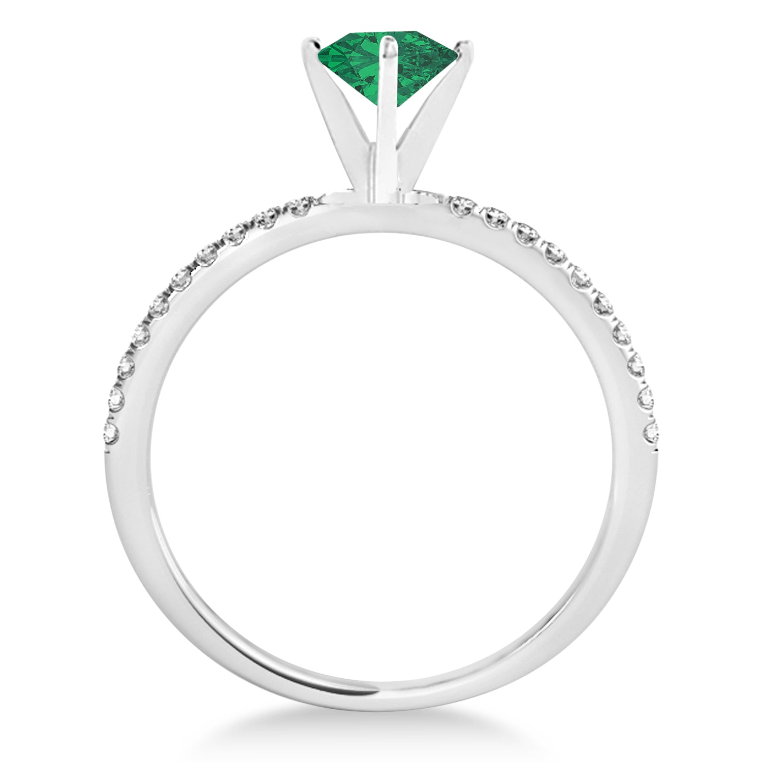 Romance personified with grace. This palladium Allurez semi-eternity band boasts a thrilling 2.88 carat oval shape center Emerald while the 20 extravagant pave-set round diamonds accenting the sides are of SI1-SI2 clarity and G-H color with an approximate carat weight of 0.12.