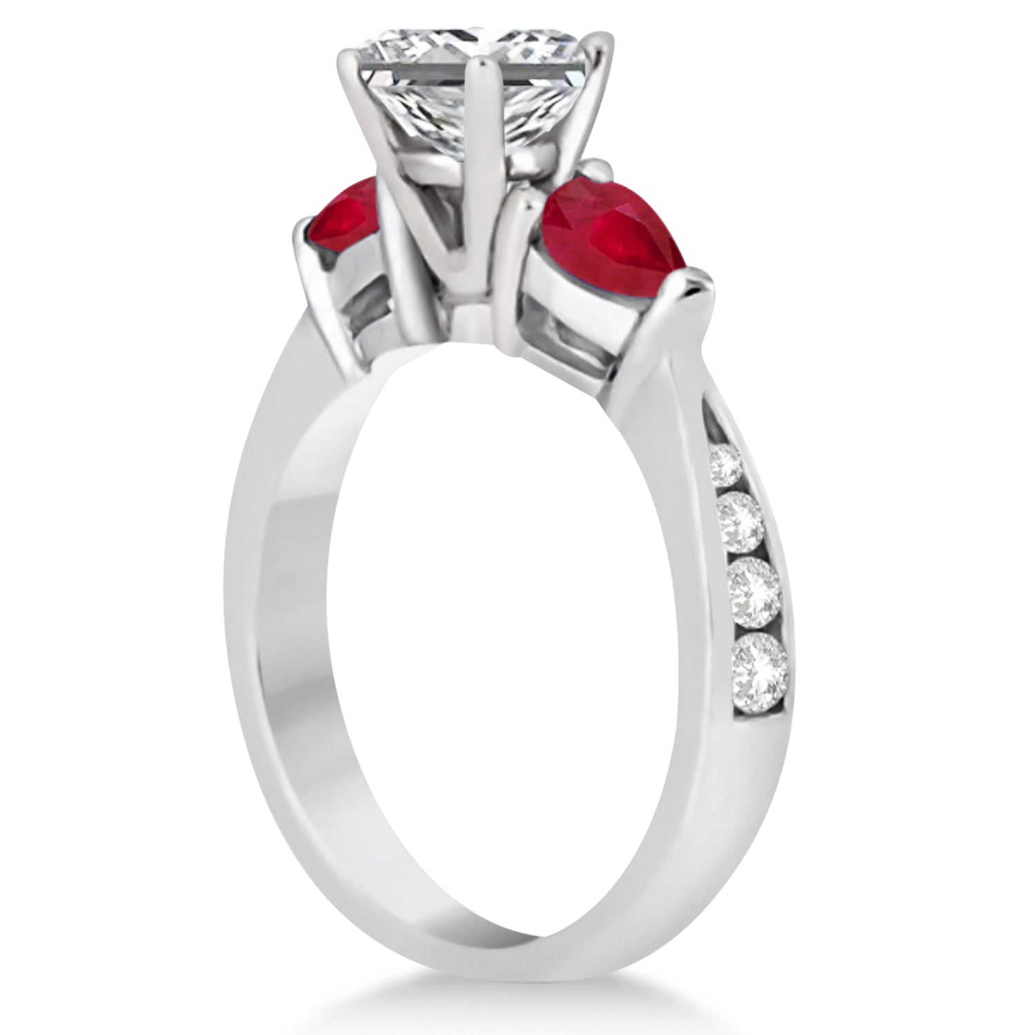 Pop the question with this fancy three stone diamond and pear cut ruby gemstone engagement...