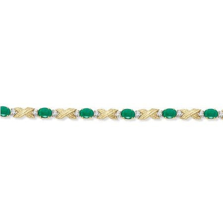 This elegant gemstone link bracelet features eleven genuine and natural oval-cut 6x4mm green emeralds all beautifully set in a 14kt yellow gold prong setting. The gemstones are beautifully accented by brilliant-cut round diamonds.