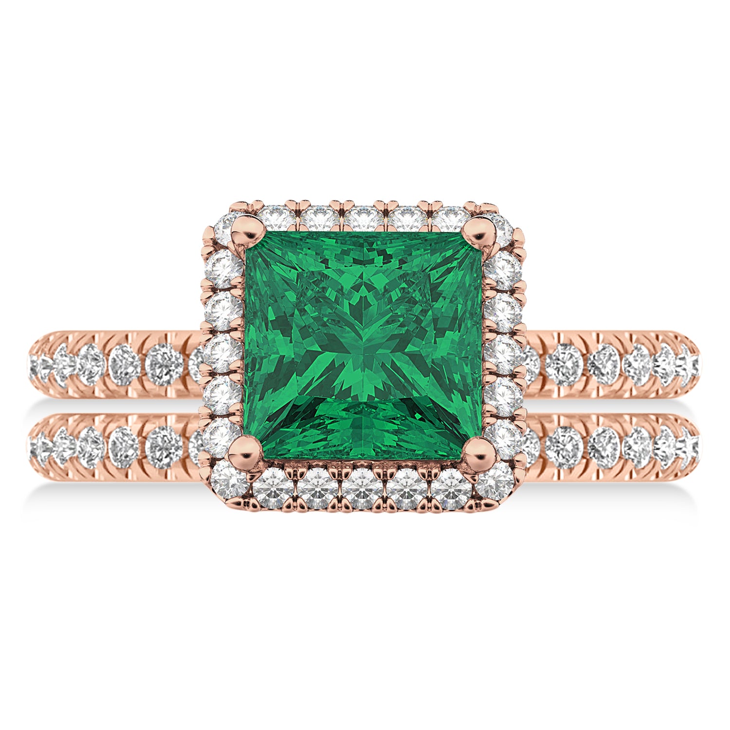 Emerald & Diamonds Princess-Cut Halo Bridal Set 14K Rose Gold (3.84ct)