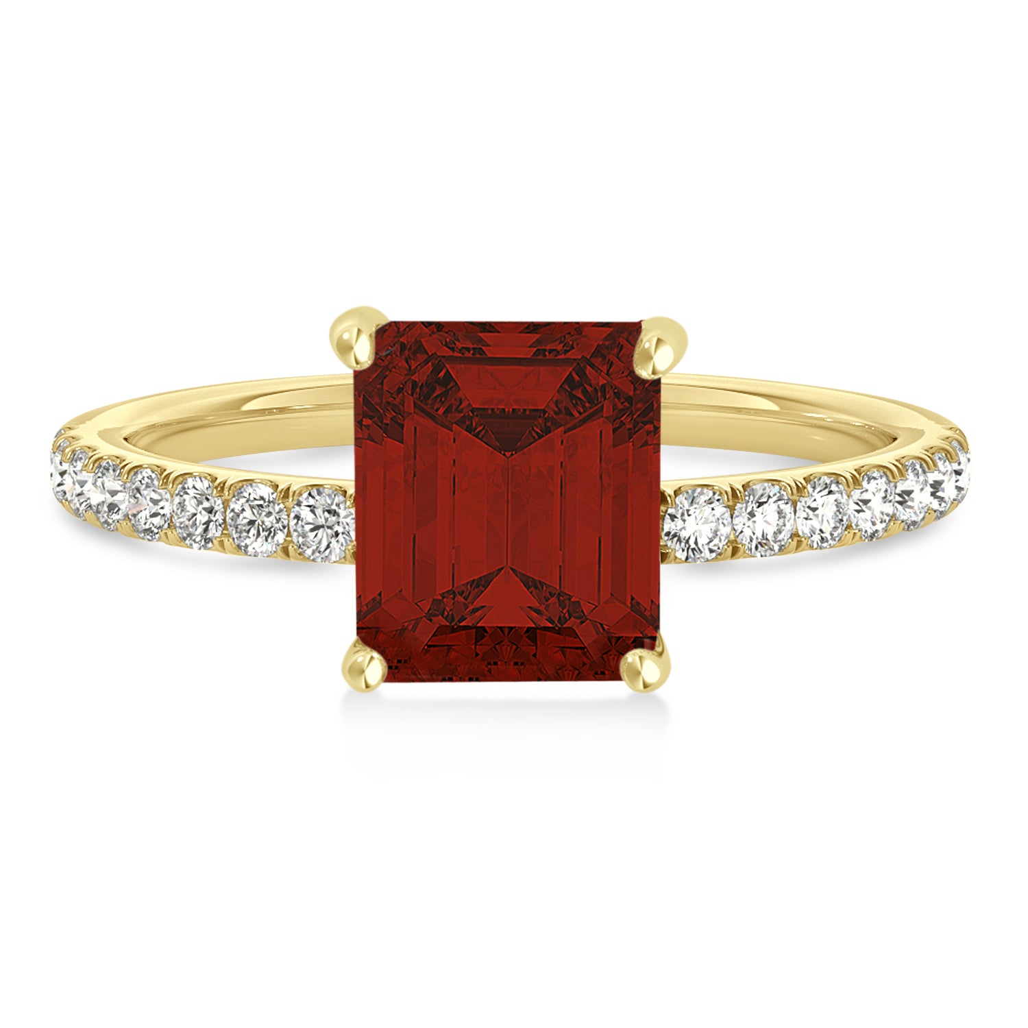 A 1.06 carat emerald-shaped Garnet is prong set into 14k Yellow Gold in this preset hidden halo engagement ring. An abundance of prong diamond accents are featured in this ring that shine endlessly.