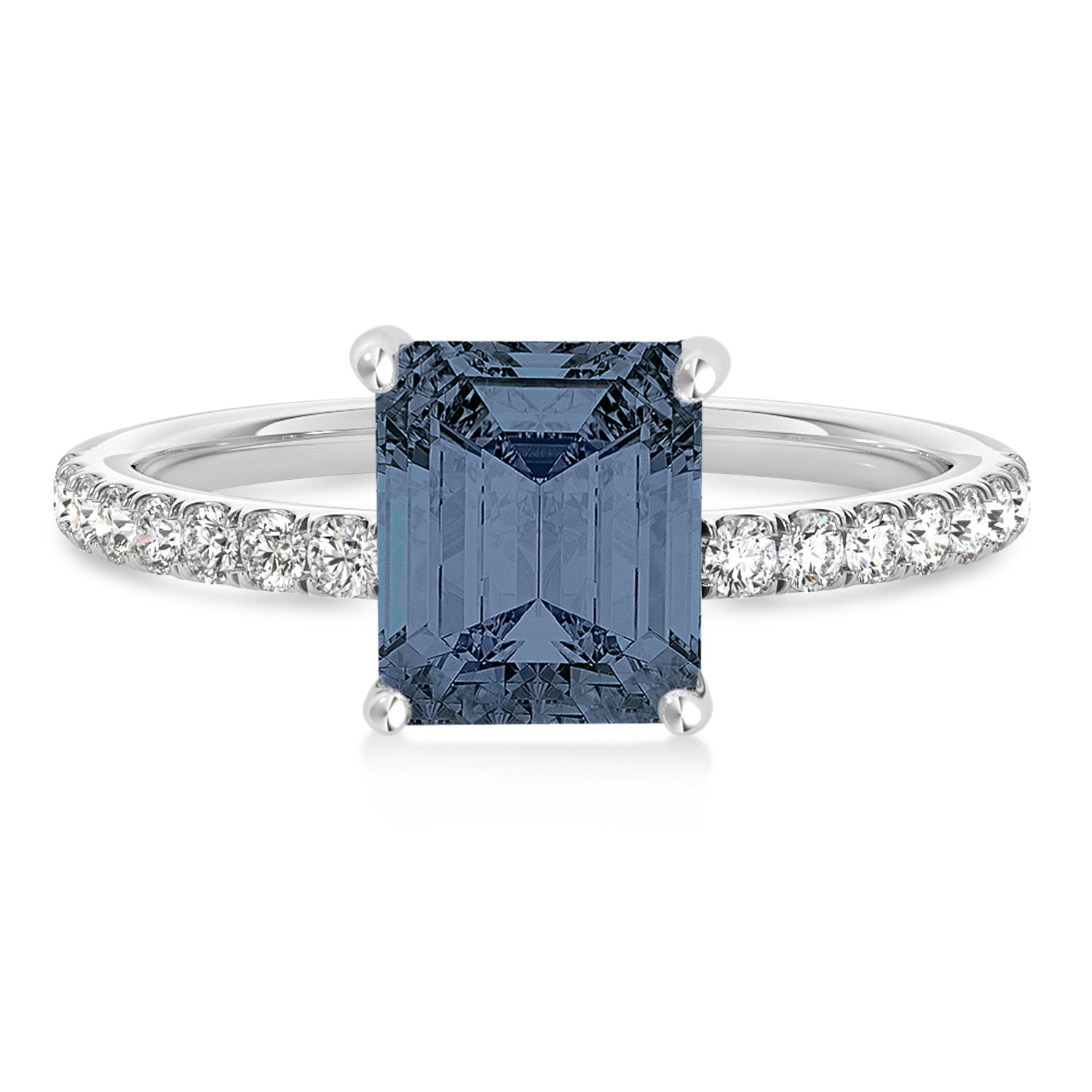 A 1.06 carat emerald-shaped Gray Spinel is prong set into 18k White Gold in this preset hidden halo engagement ring. An abundance of prong diamond accents are featured in this ring that shine endlessly.