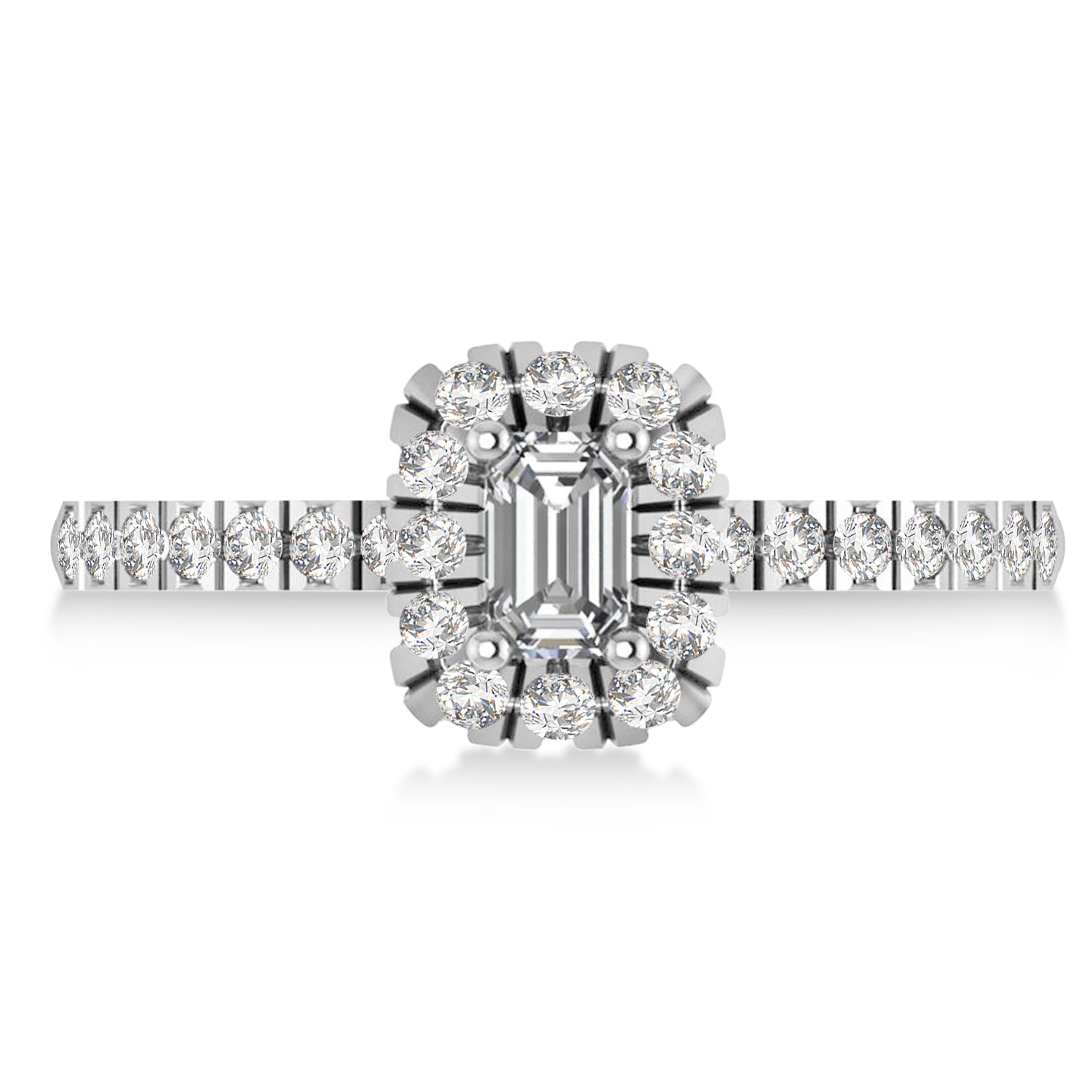 This eye-catching Lab Grown Diamond ring features 0.39ct total weight of encrusted diamonds on the thin 14k White Gold band, as well as surrounding a 1ct Emerald cut Lab Grown Diamond.