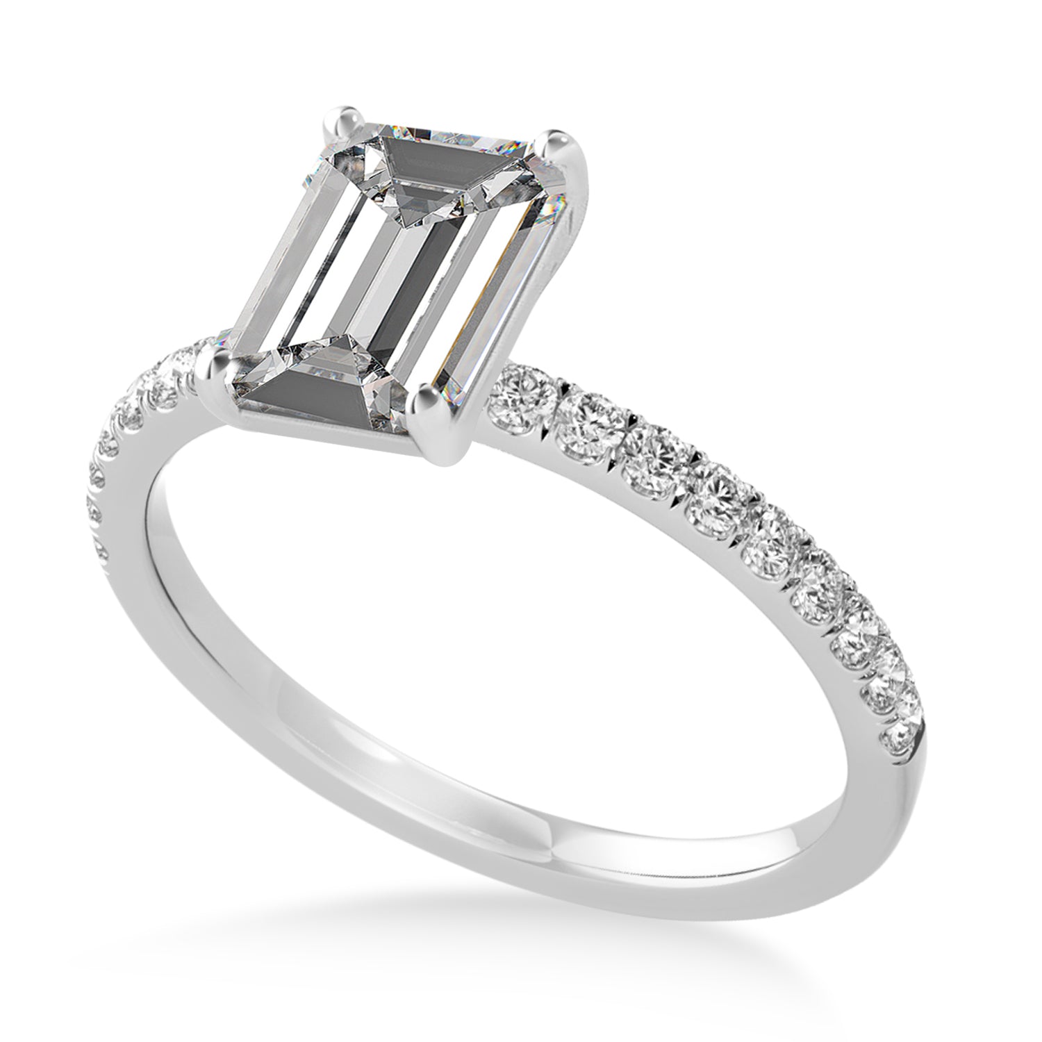 A 1.06 carat emerald-shaped Moissanite is prong set into 14k White Gold in this preset hidden halo engagement ring. An abundance of prong diamond accents are featured in this ring that shine endlessly.